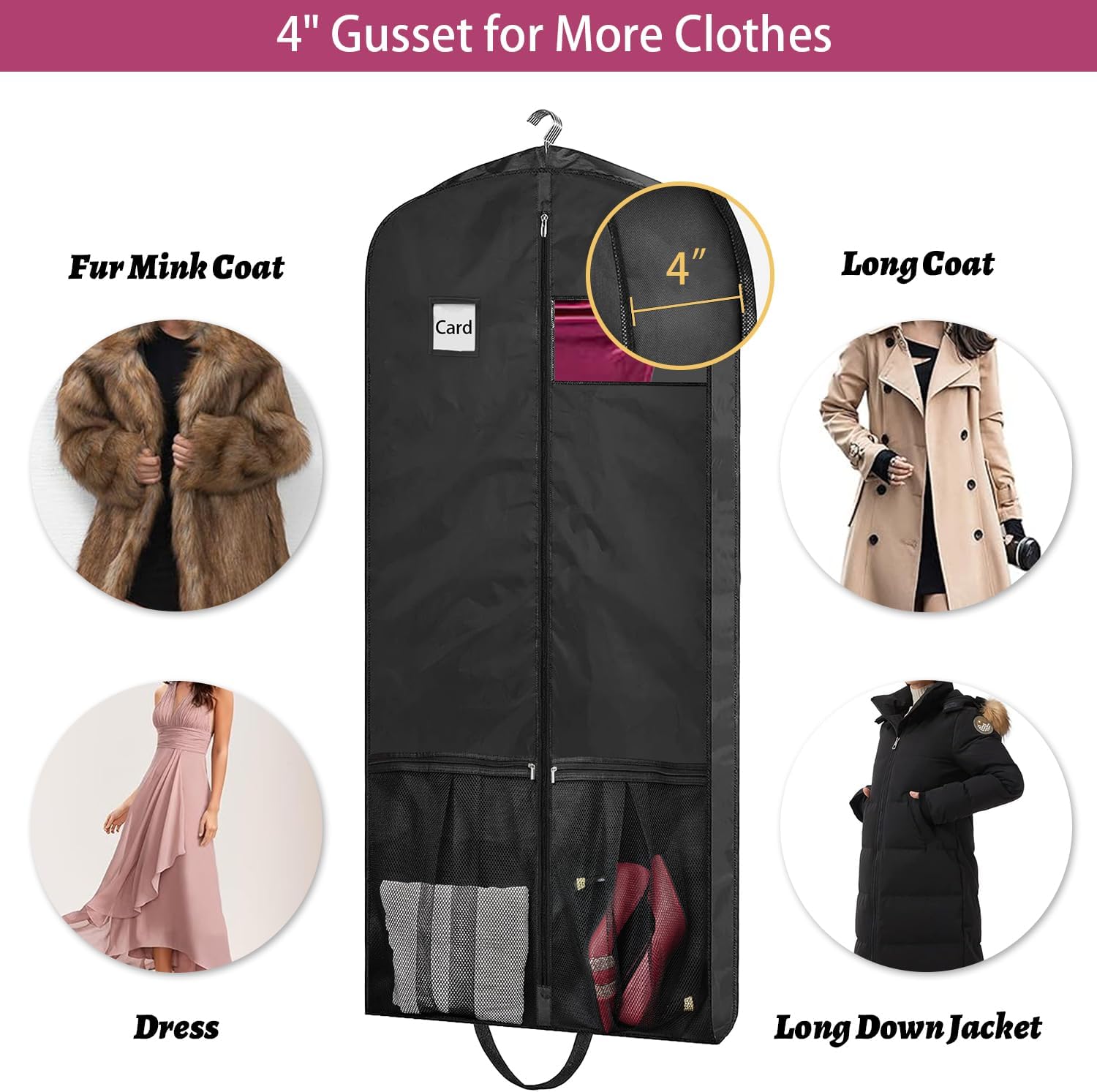 54" Garment Bags for Travel, 2 Pack Dress Bag for Hanging Clothes Storage with Pockets and Clear Window, 4" Dress Storage Bag for Long Coat, Jacket, Sweater, Shirts, Suits