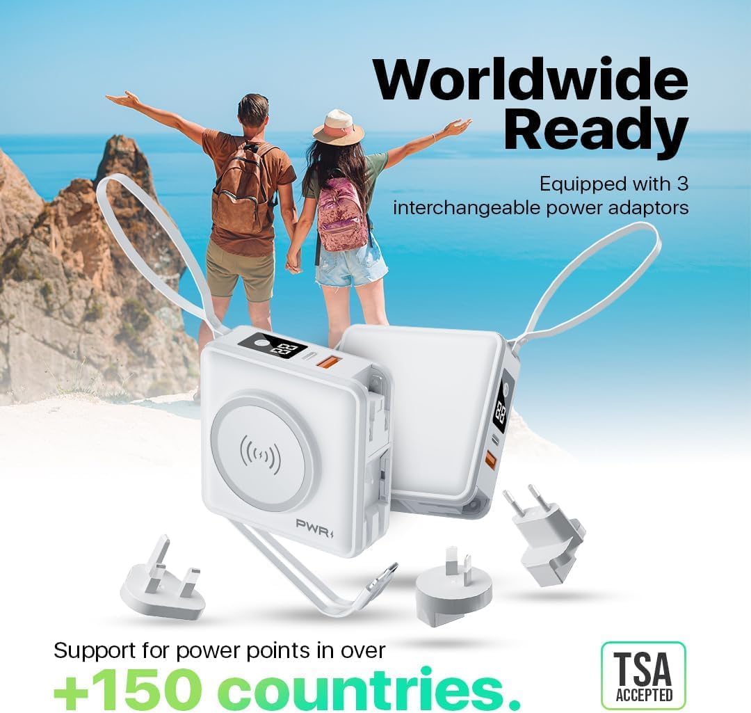 PWR Travel PRO 5-in-1 Power Bank with Case Included – 10,000mAh with Built-in Cables – 20W USB-C + 15W Wireless Charging – Compact Portable Charger for iPhone & Android - White