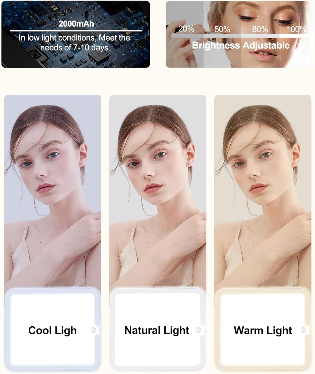 - 【Professional 3-Color Fill Light Mirror】Makeup bag with detachable velcro makeup mirror, and gently touching the switch can easily adjust color temperature between cold light, natural light, and warm light, revealing true skin & facial details, Long press to control the brightness from 0% to 100%. Widely use for sophisticated party, business attendance, or daily makeup.