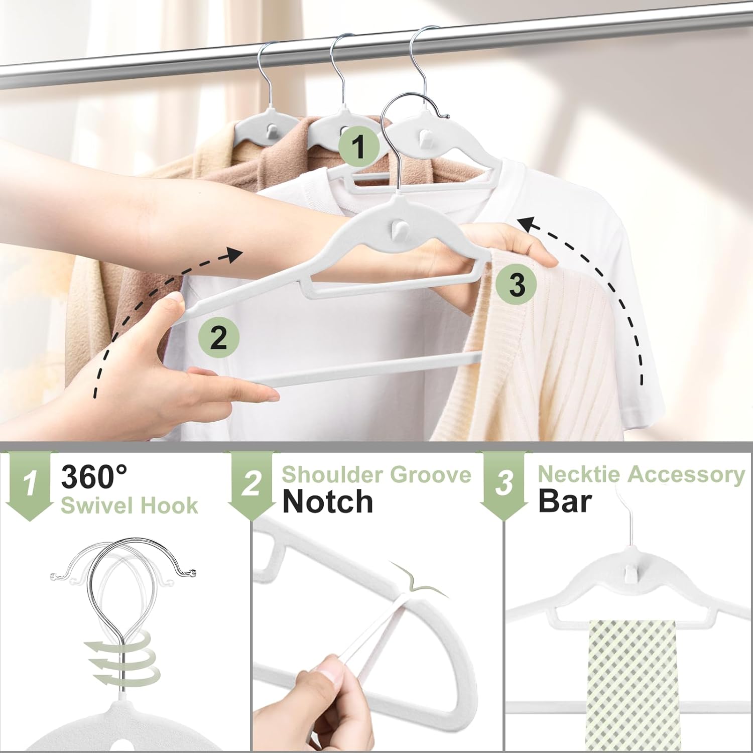 Velvet Felt Stackable Hangers 50 Pack, Non Slip, with 360°Swivel Hook, Ultra Thin and Space Saving for Suits, Shirts, Coats, 15Lbs Capacity Heavy Duty, White