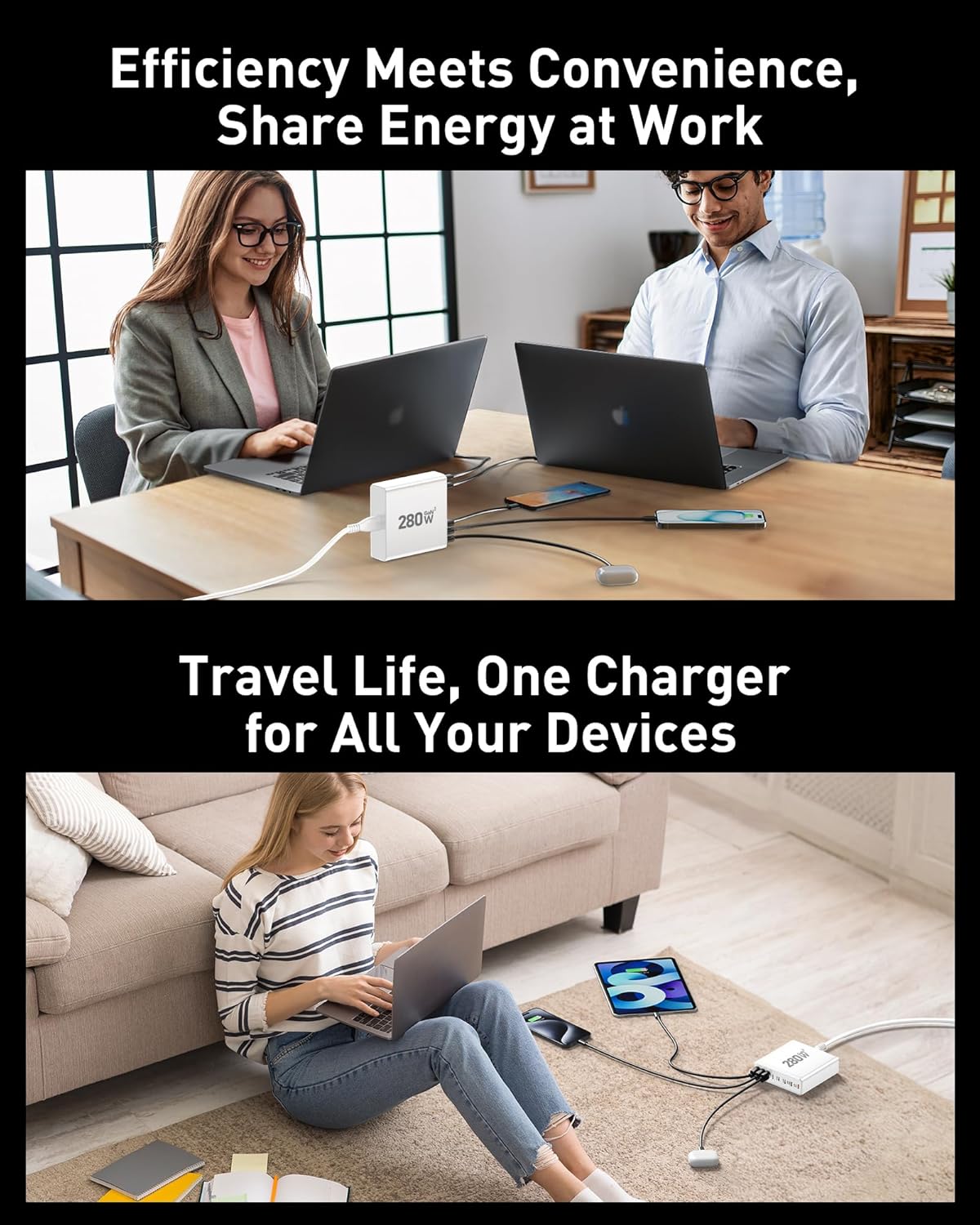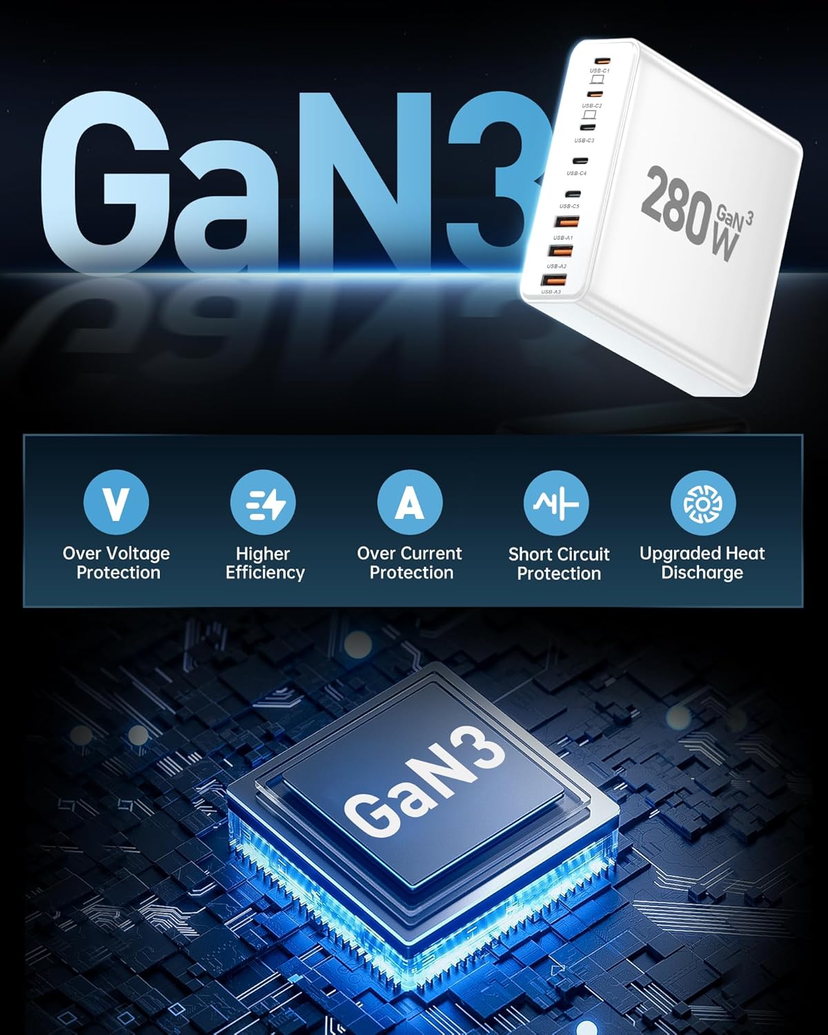 - 【8 in 1 USB C Charging Station】 65W x 2 USB C and 30Wx3 USB C+20Wx3 USB A (280W Total), We USB C charging stations feature 8 independent output ports.power delivery Compatible with laptops, phones, tablets, headphones, smartwatches and more. The fast charger type c charger power supply has an input voltage of 100-240 volts, when you connect 8 devices, the power will be distributed the ports to ensure you get the best charge.