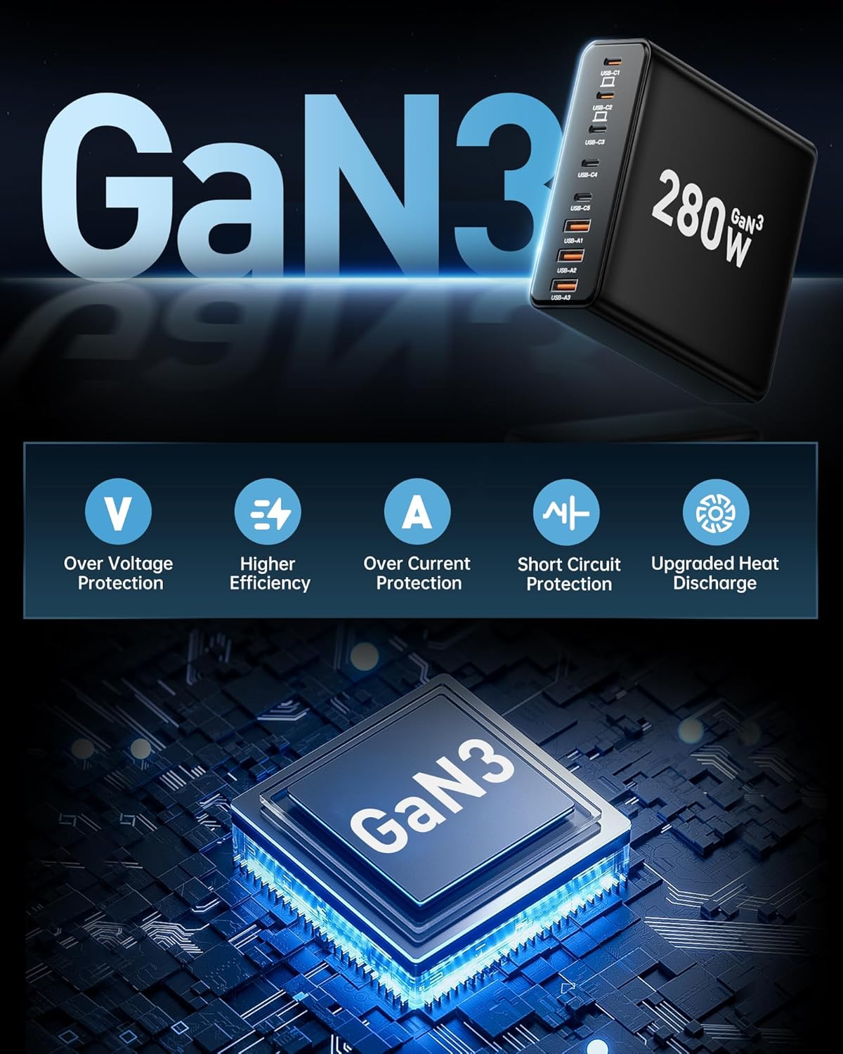 280W USB C Charger Block, 8-Port USB C Charging Station GaN III PD 65W Laptop Charger Adapter Compatible with MacBookPro/Air,DELL,iPad,Portable Charging Station for iPhone,Samsung Galaxy (Black)