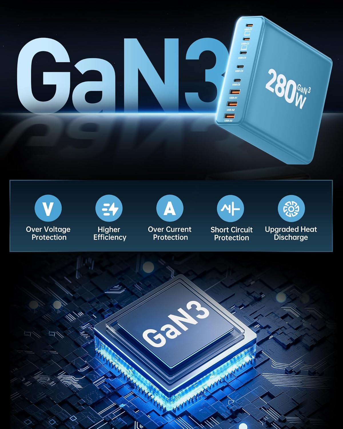 280W USB C Charger Block, 8-Port USB C Charging Station GaN III PD 65W Laptop Charger Adapter Compatible with MacBookPro/Air,DELL,iPad,Portable Charging Station for iPhone,Samsung Galaxy(Blue)
