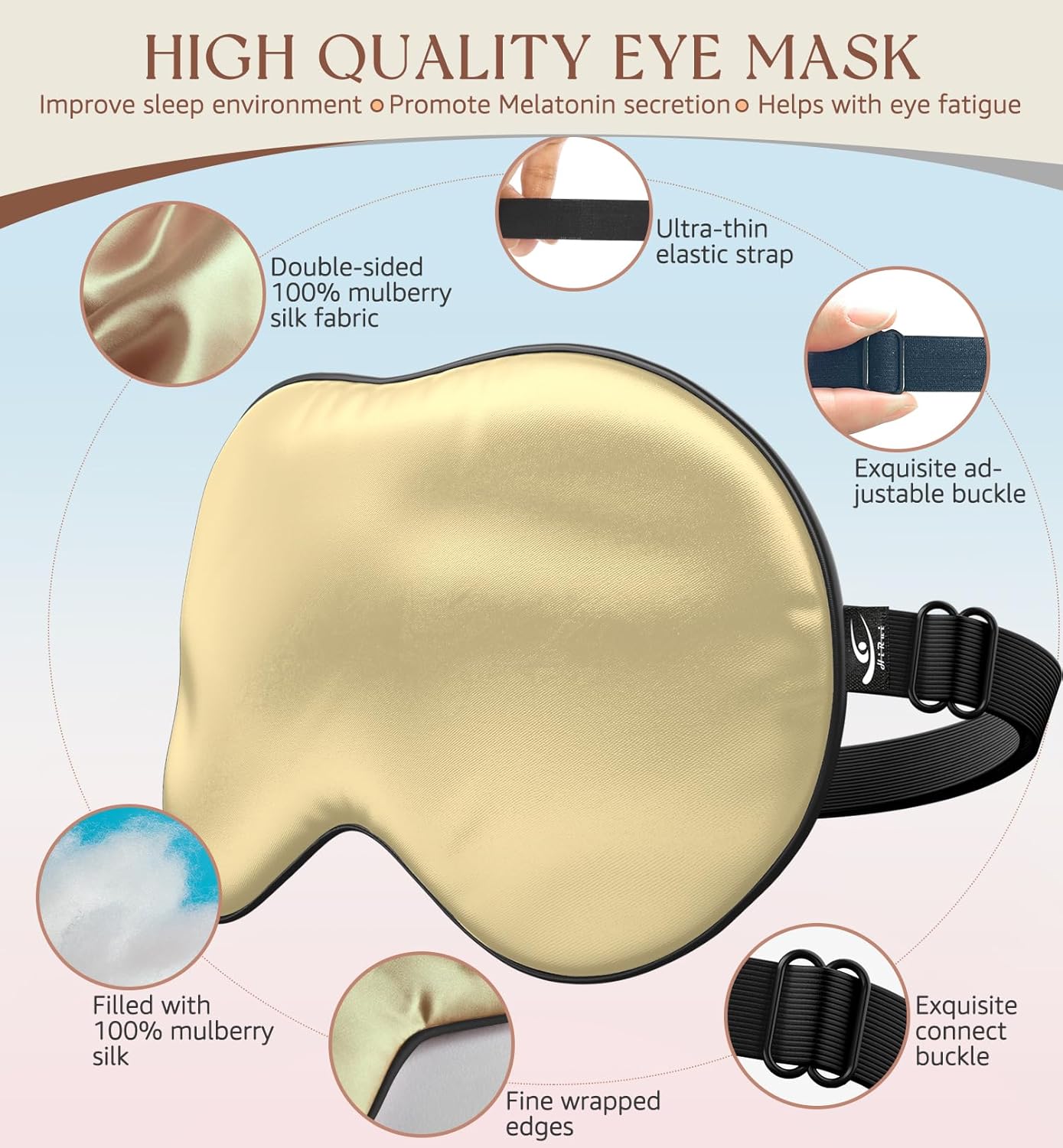 HiRui Silk Sleep Mask, 100% Natural Mulberry Silk of Double-Sided & Inner-Filling, Ultra-Smooth Soft, Adjustable Strap, Blocks Light for Night Sleeping, Travel, Office Naps (Champagne)