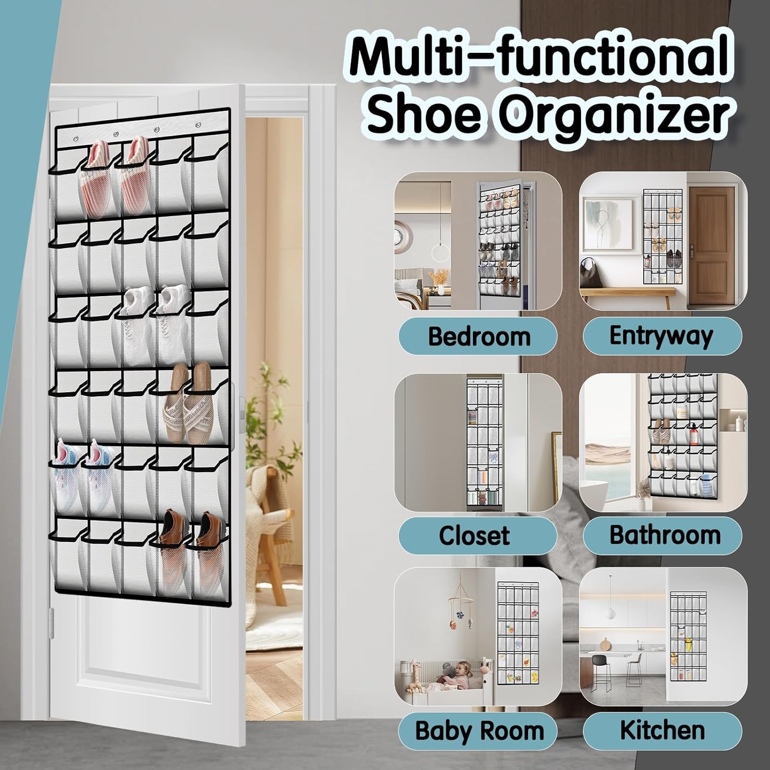 - 👞【MULTI-FUNCTIONAL HANGING ORGANIZER-】: hanging shoe organizer for closet can free up floor/shelf space. Not just for organizing shoes, this over-the-door shoe rack can also be used to organize socks, ties, scarves, and even toys, snacks, kitchen supplies, toiletries and cleaning supplies. The shoe organizer can help you save space in addition to keeping our home clean and tidy. Say goodbye to clutter this time, it's simply a great home organizer.