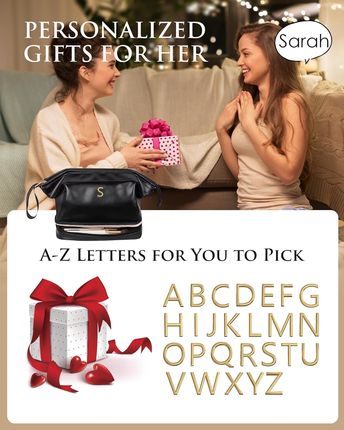 Travel Essentials for Friends Female Mom, Personalized Makeup Bag, Double Layer Cosmetic Bag with Makeup Brush Organizer, Waterproof, Large Capacity PU Leather Toiletry Bag Customized Gifts
