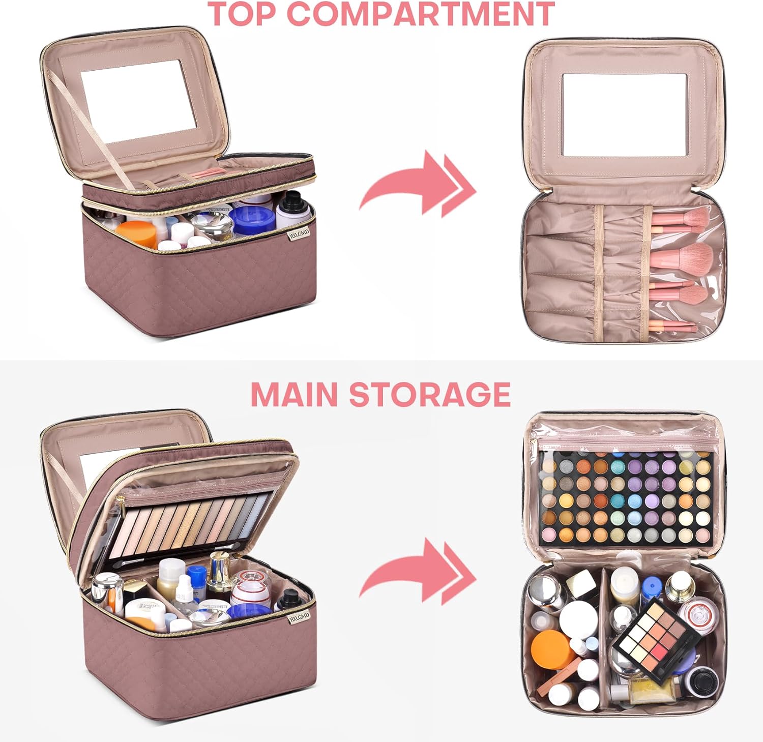 Large Makeup Bag with Mirror Double Layer Travel Make Up Organizer Case, Large Capacity Coemetic Bag with Brush Slot Divider