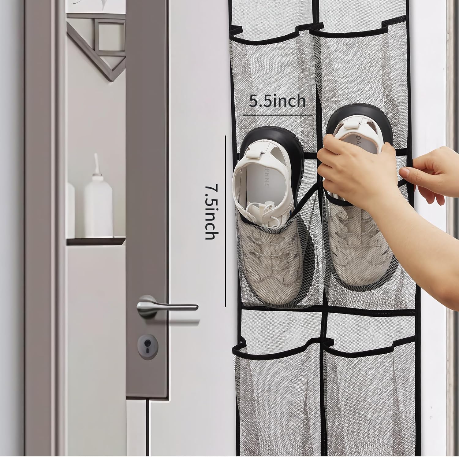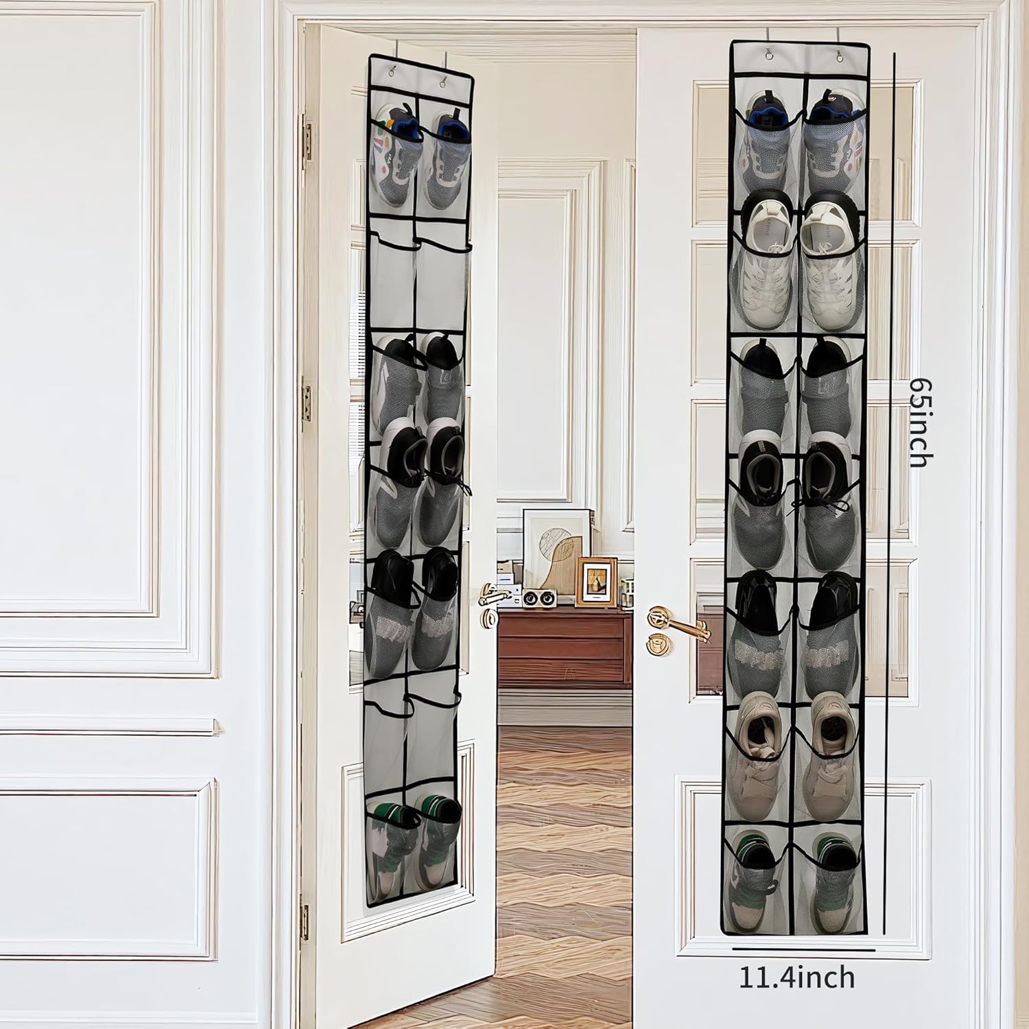 - OVER-DOOR SHOE ORGANIZERS WITH 28 POCKETS: Store 14 pairs of shoes, including womenโs heels, sneakers, or menโs size 13 footwear. Reinforced mesh pockets prevent sagging and keep items visible