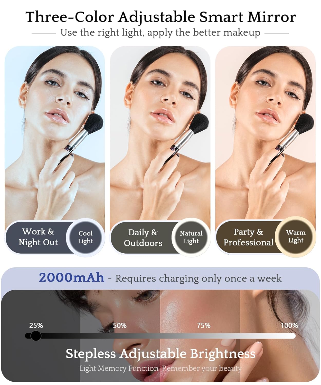 - 💡【Detachable Smart Fill Light Mirror】Enhance your makeup routine with this smart fill light mirror featuring adjustable light intensity and a memory function. The 360° adjustable mirror stand ensures no angle is missed, while the touch switch offers cool, natural, or warm light options for true-to-life makeup application. Say goodbye to battery worries with its long-lasting 2000mAh battery.