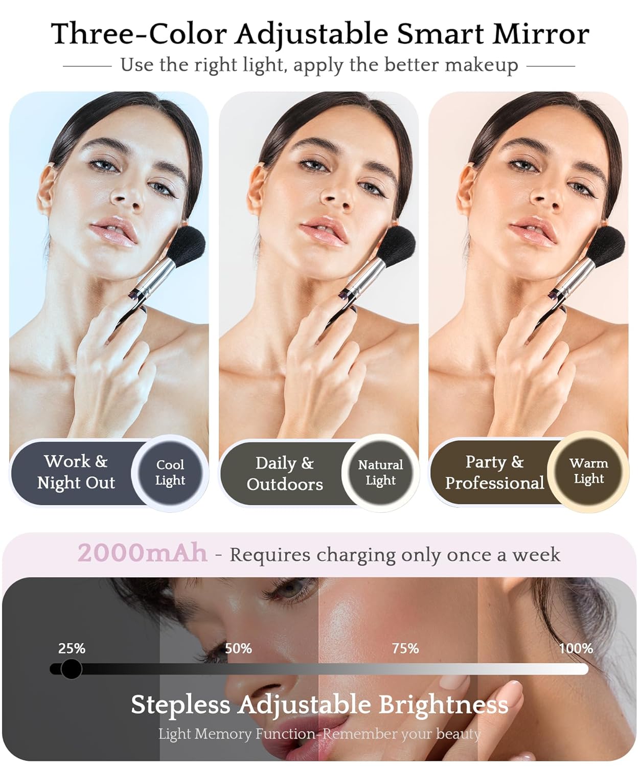 - 💡【Detachable Smart Fill Light Mirror】Enhance your makeup routine with this smart fill light mirror featuring adjustable light intensity and a memory function. The 360° adjustable mirror stand ensures no angle is missed, while the touch switch offers cool, natural, or warm light options for true-to-life makeup application. Say goodbye to battery worries with its long-lasting 2000mAh battery.