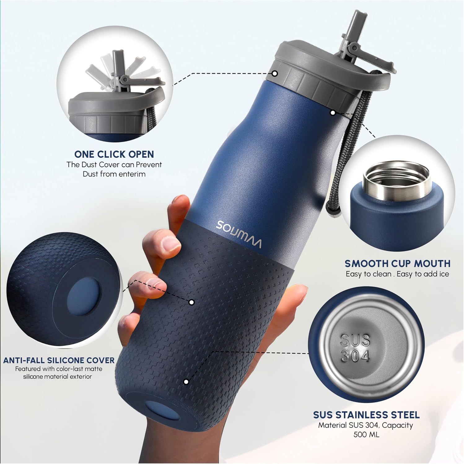 - Premium-Grade Stainless Steel Construction: Crafted from high-quality SUS 304 water bottle stainless steel, this bottle is rust-resistant, durable, and designed for daily use. The stainless steel insulated water bottle has a powder-coated exterior that ensures a non-slip grip and long-lasting finish, making it perfect for active lifestyles