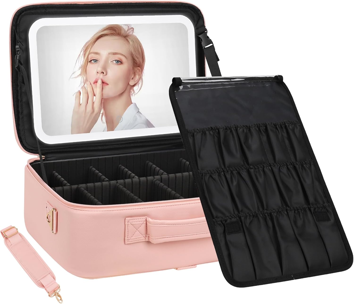 - What You Get: Makeup bag, 10 Pcs adjustable dividers, USB rechargeable makeup mirror (104 LED Beads, 2000mAh), USB charging cable, shoulder strap, worry-free 12-month warranty and our friendly customer service.