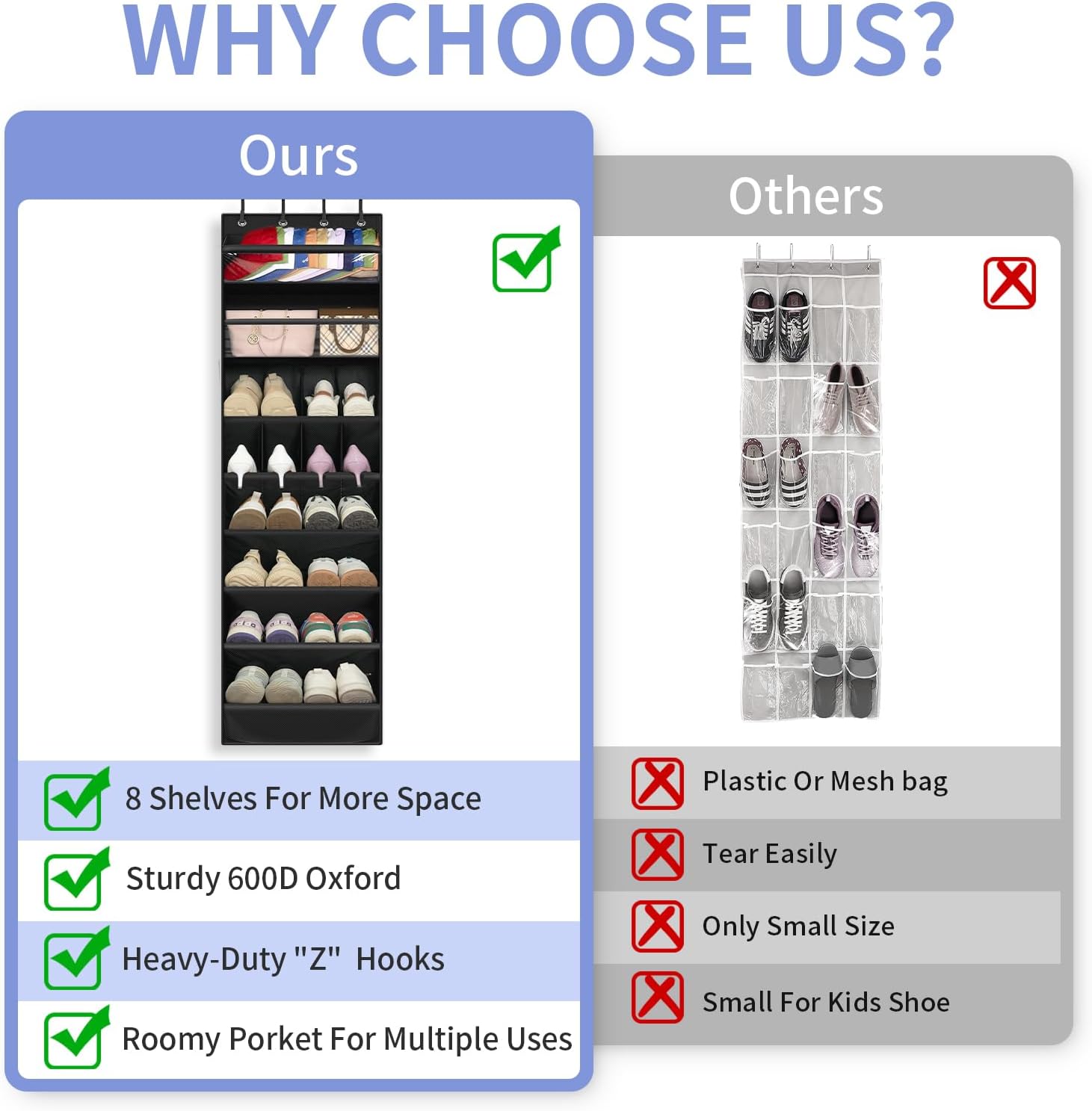 - 8 Shelves Large Capacity: Over the door shoe rack measures 68"H*16.5"L*6"W. Please measure the height of the door is greater than 71 inches before buying. Hanging shoe storage with 13 pockets in different sizes can hold more than 22 pairs of shoes.Shoe closet organizer is large and deep enough to store high heels and boots.And back of door shoe organizer is a great home storage organizer and helps to increase more space for over door, closet, wall, dorm, and RV, making your room more tidy and clean.