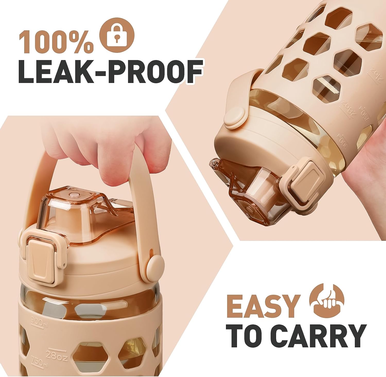 MUKOKO 32 oz Glass Tumbler with Straw,Glass Water Bottles with Time Marker,Iced Coffee Cup with 2 Lids-Handle Spout Lid&Straw Lid,Silicone Sleeve,Leakproof,1 Pack-Amber