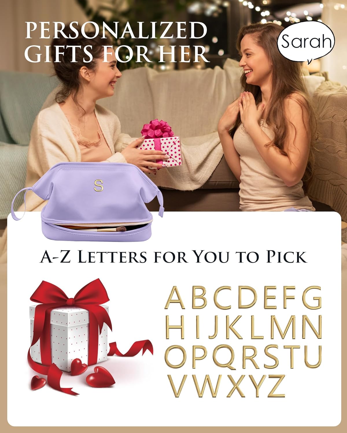Initial Makeup Bag, Daughter Gifts, Personalized Double Layer Cosmetic Bag with Makeup Brush Organizer, Waterproof, Large Capacity PU Leather Travel Toiletry Bag Cute Things for Girls