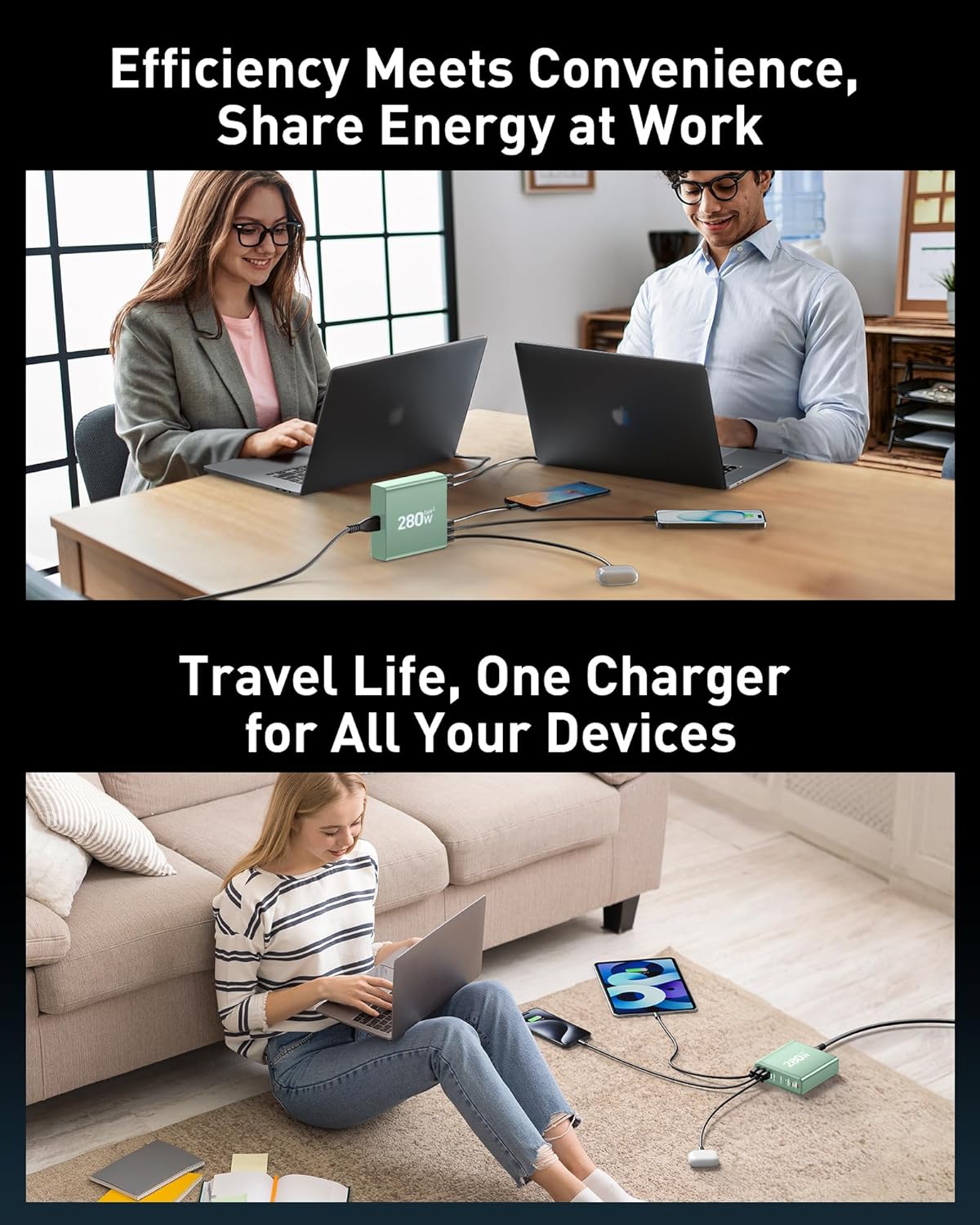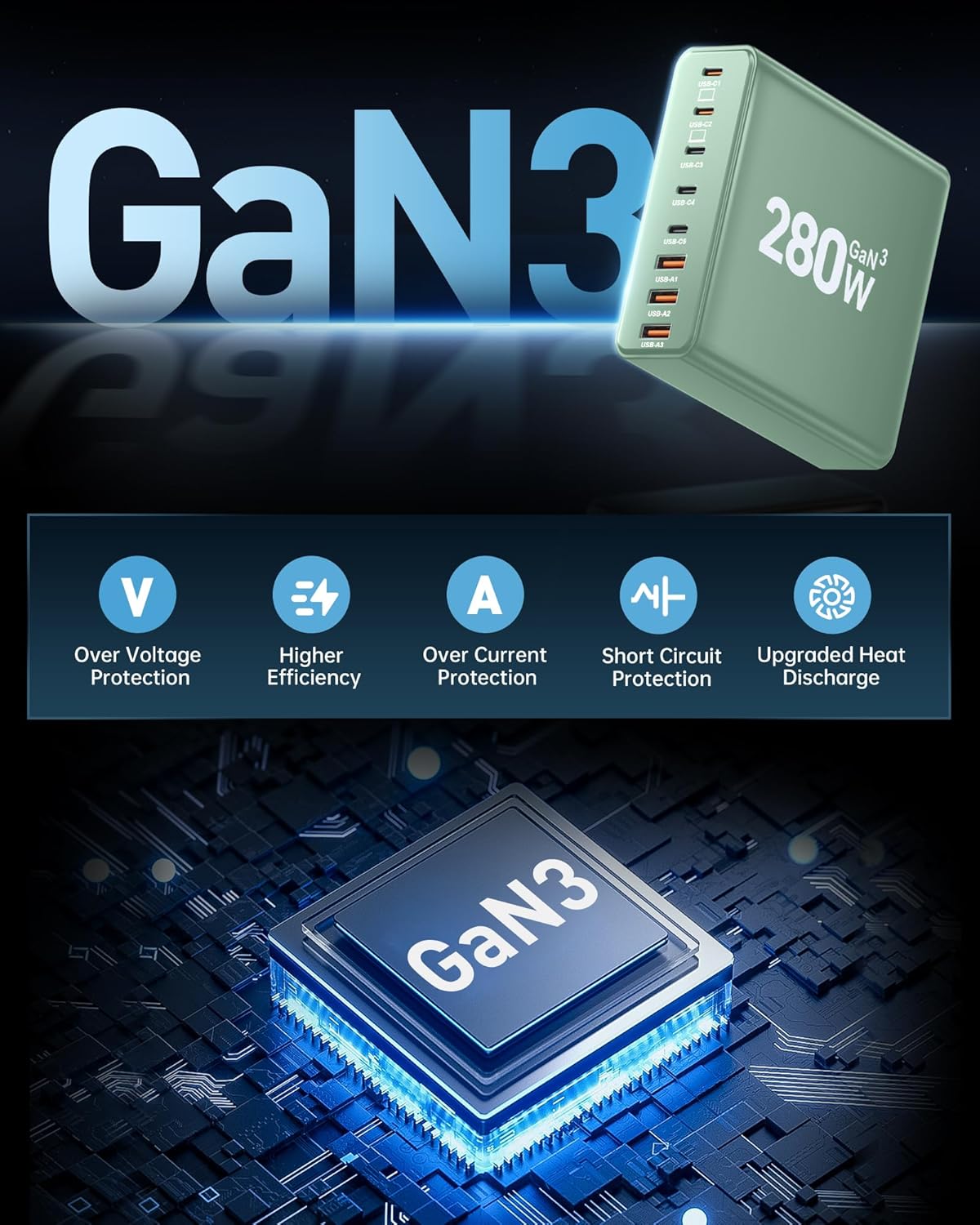 280W USB C Charger Block, 8-Port USB C Charging Station GaN III PD 65W Laptop Charger Adapter Compatible with MacBookPro/Air,DELL,iPad,Portable Charging Station for iPhone,Samsung Galaxy(Green)