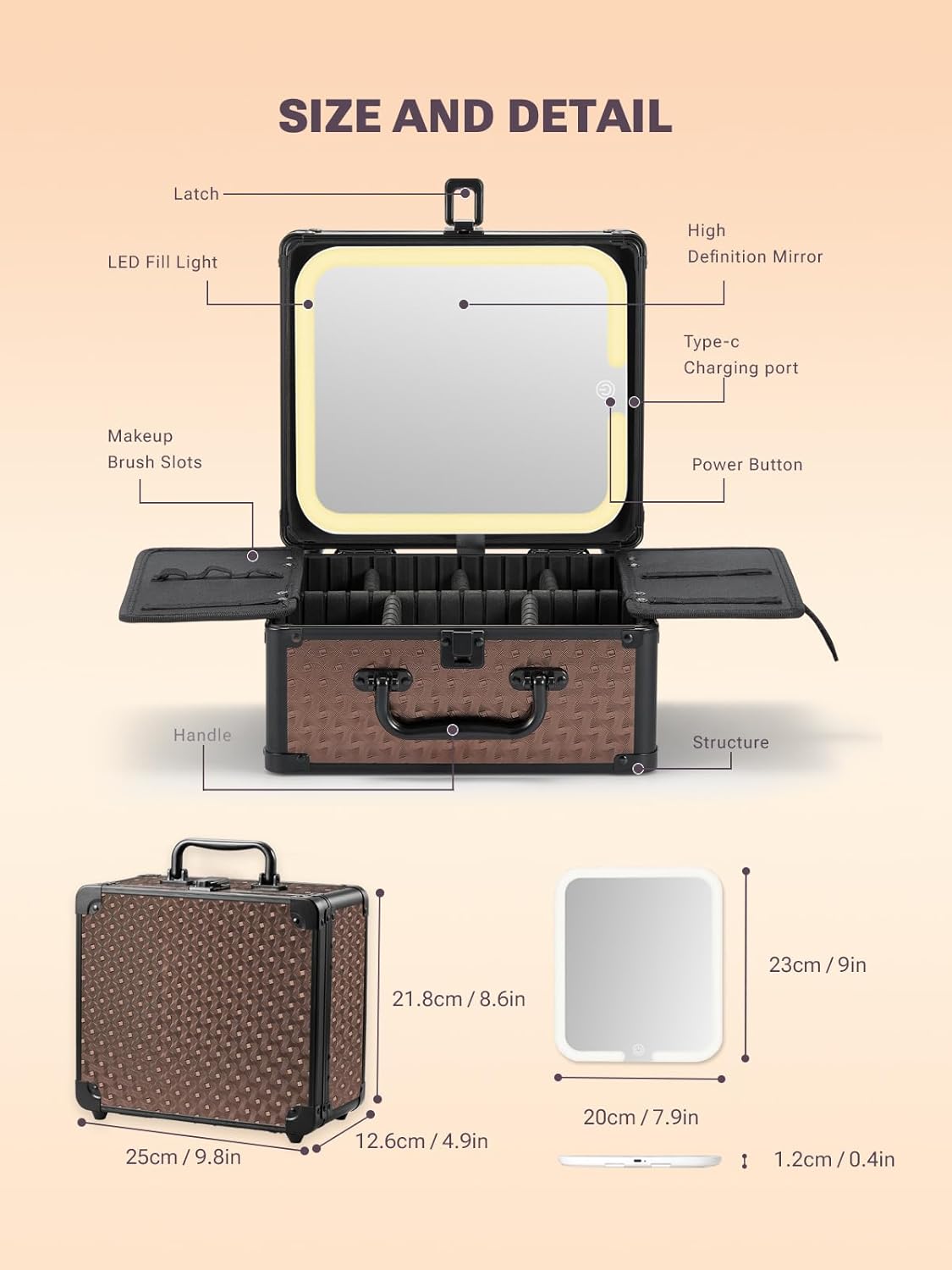 Qislee Makeup Box with A Detachable Lighted Mirror, Waterproof Travel Train Case, Cosmetic Organizer and Makeup Suitcase with Adjustable Dividers, Magnetic LED Mirror(Golden Brown)