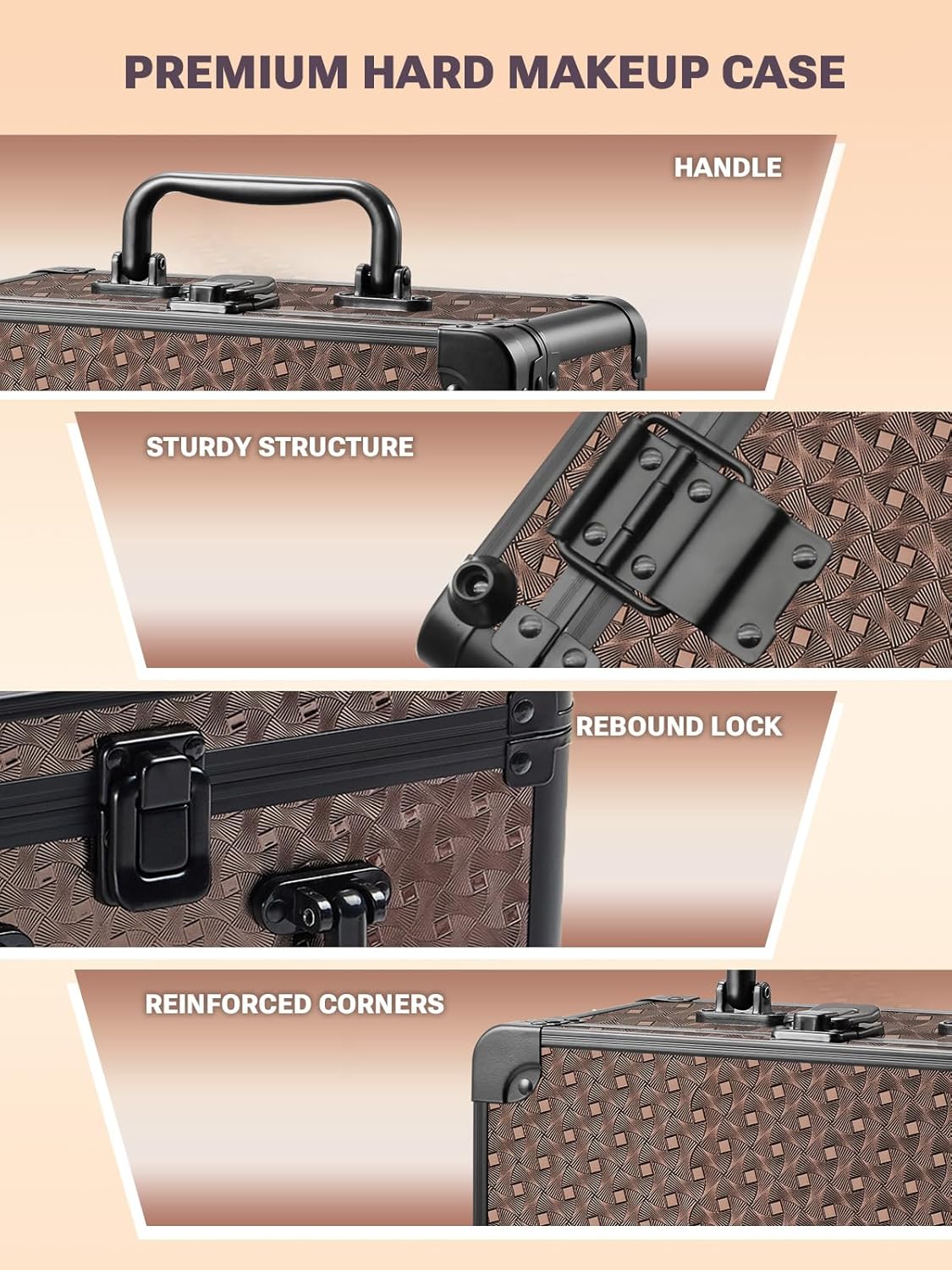 - Professional Hard Makeup Travel Case: Measuring 9.6x8.3x4.9 inches, this portable case is ideal for all makeup artists. Made with cardboard and metal-reinforced corners for durability, it features a latch with a quick rebound lock