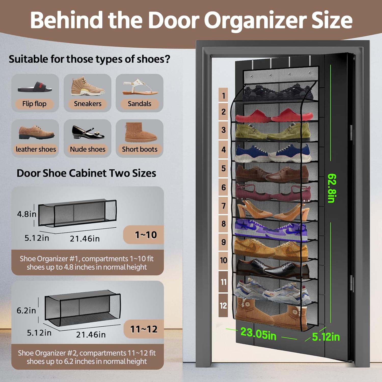 - 🥾👒👘【ENLARGED AND BREATHABLE MESH POCKETS SIZE】: The whole hanging shoe rack measures 64.5“(L) x 23.05”(W) with 12 pockets.Breathable and spacious, fast drying, don't worry about odor and mold. The large and wide pockets can accommodate men's size 14 shoes, or a pair of children's shoes can also fit into 1 pocket.Size 13 shoes can fit completely into the slots, larger shoes please place on the bottom.