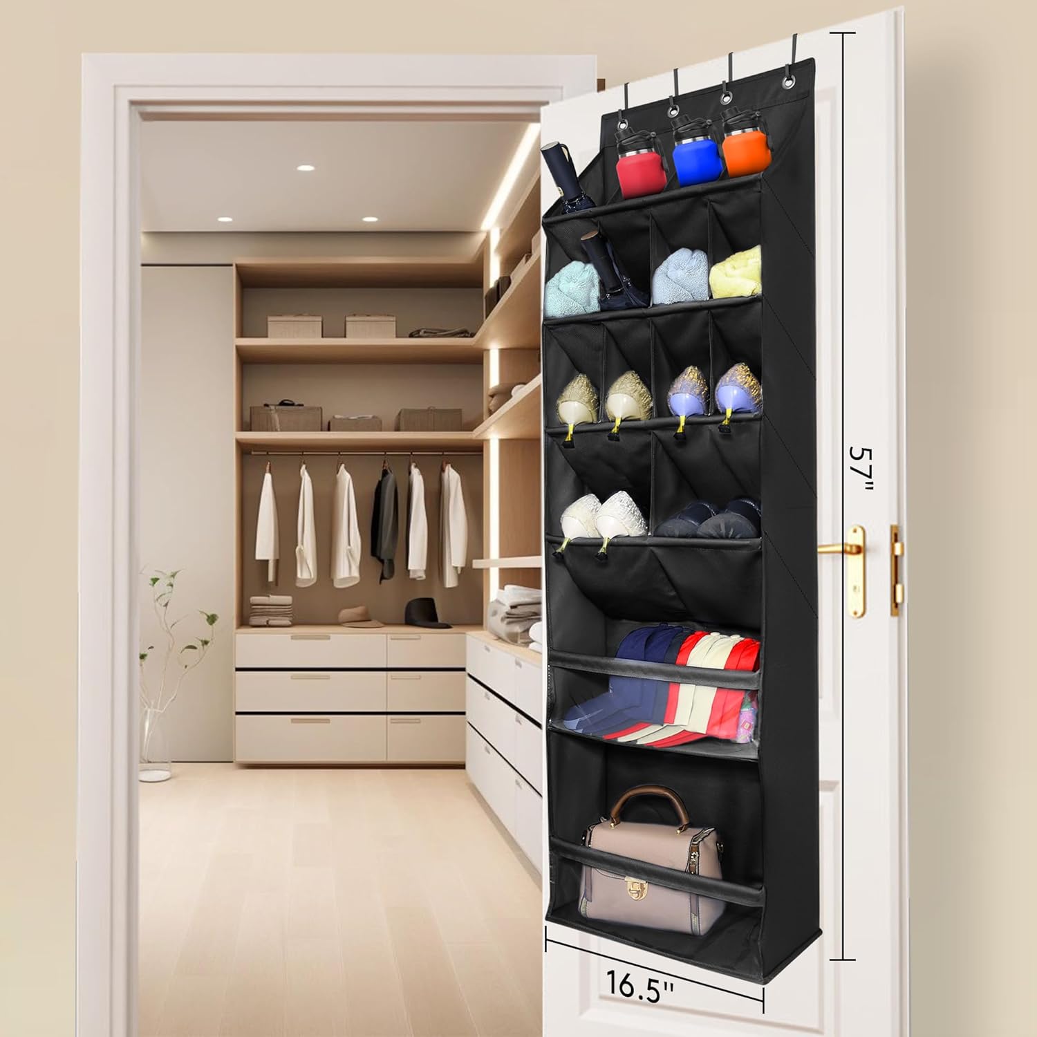 - 4 Sturdy Hooks & Easy to Use: Each door shoe organizer has 4 heavy duty grommets and 4 removeable metal hooks which fit most standard door between 1.35" to 1.57" thick, easy to install on the door and don't need any tools. The 16.5“ wide hanging shoe rack suitable for most door of closets, bathroom, bedroom, baby or kid room, pantry room, laundry room, playroom, college, etc.