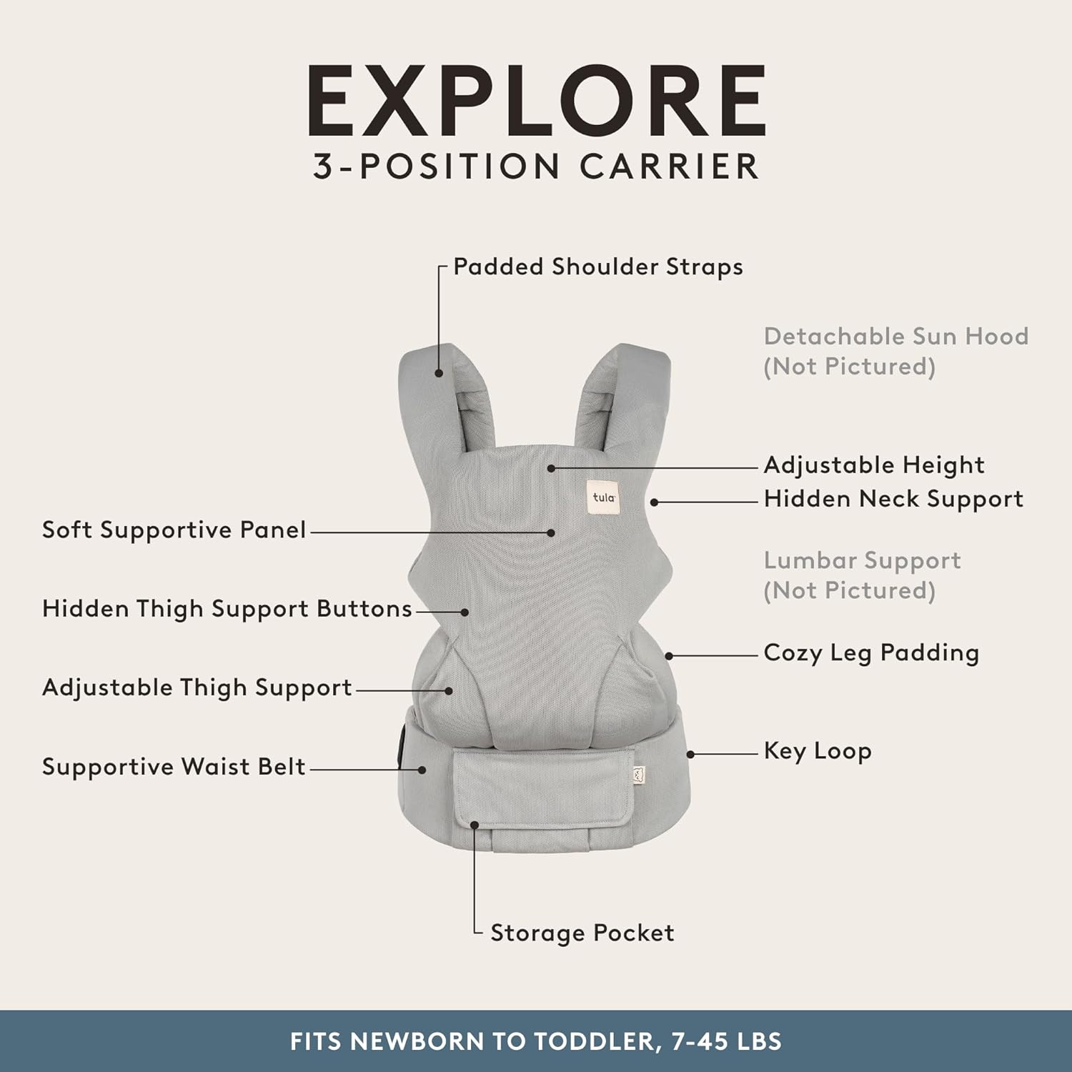 Baby Tula Explore Carriers - Breathable Baby Carrier Newborn to Toddler - Adjustable Toddler Carrier - Multiple Ergonomic Positions Front and Back - Ergonomic Fit for 7-45 lb - Mesh, Overcast