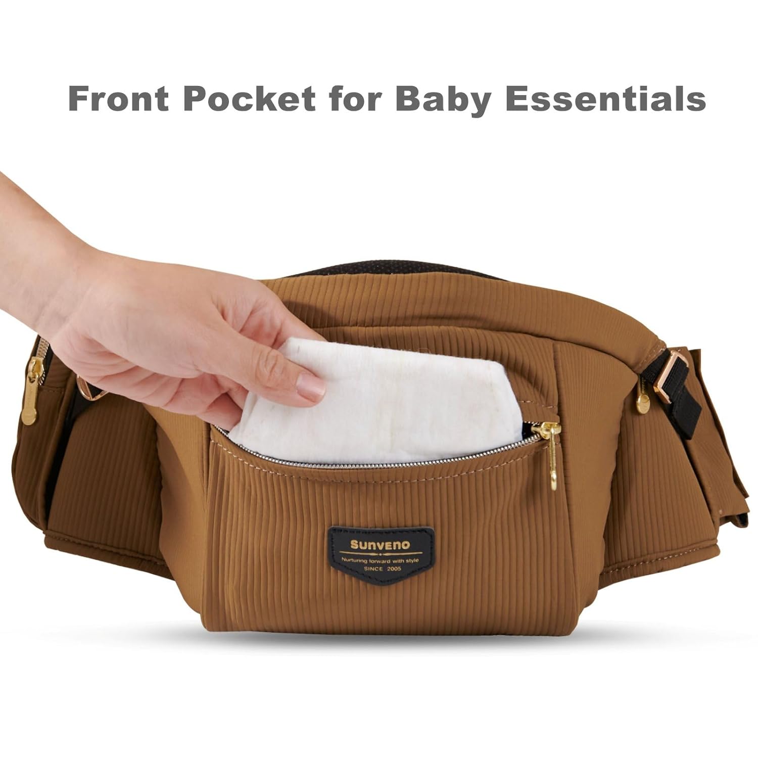 Sunveno Hip Baby Carrier with Seat,Ergonomic Baby Hip Carrier, Front-Facing Baby Holder, Anti-Slip Seat Surface, Wide and Adjustable Waistband,Multiple Pockets, Newborn to Toddler up to 45lbs, Brown