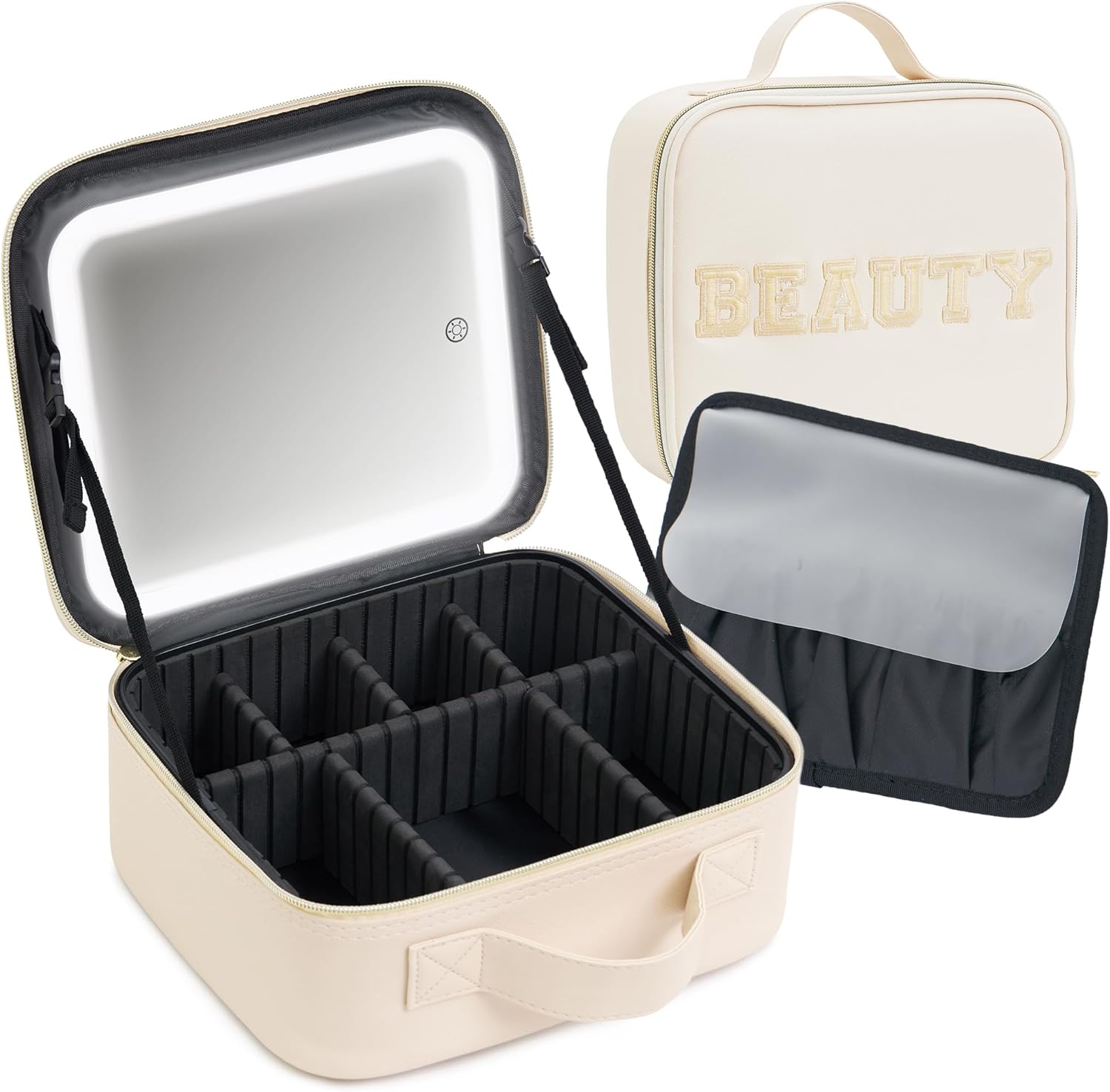 Makeup Bag with LED Mirror – Travel Cosmetic Organizer with Lighted Mirror, Adjustable Dividers & Brush Holder Storage – Portable PU Leather Makeup Case for Women & Girls - Cream