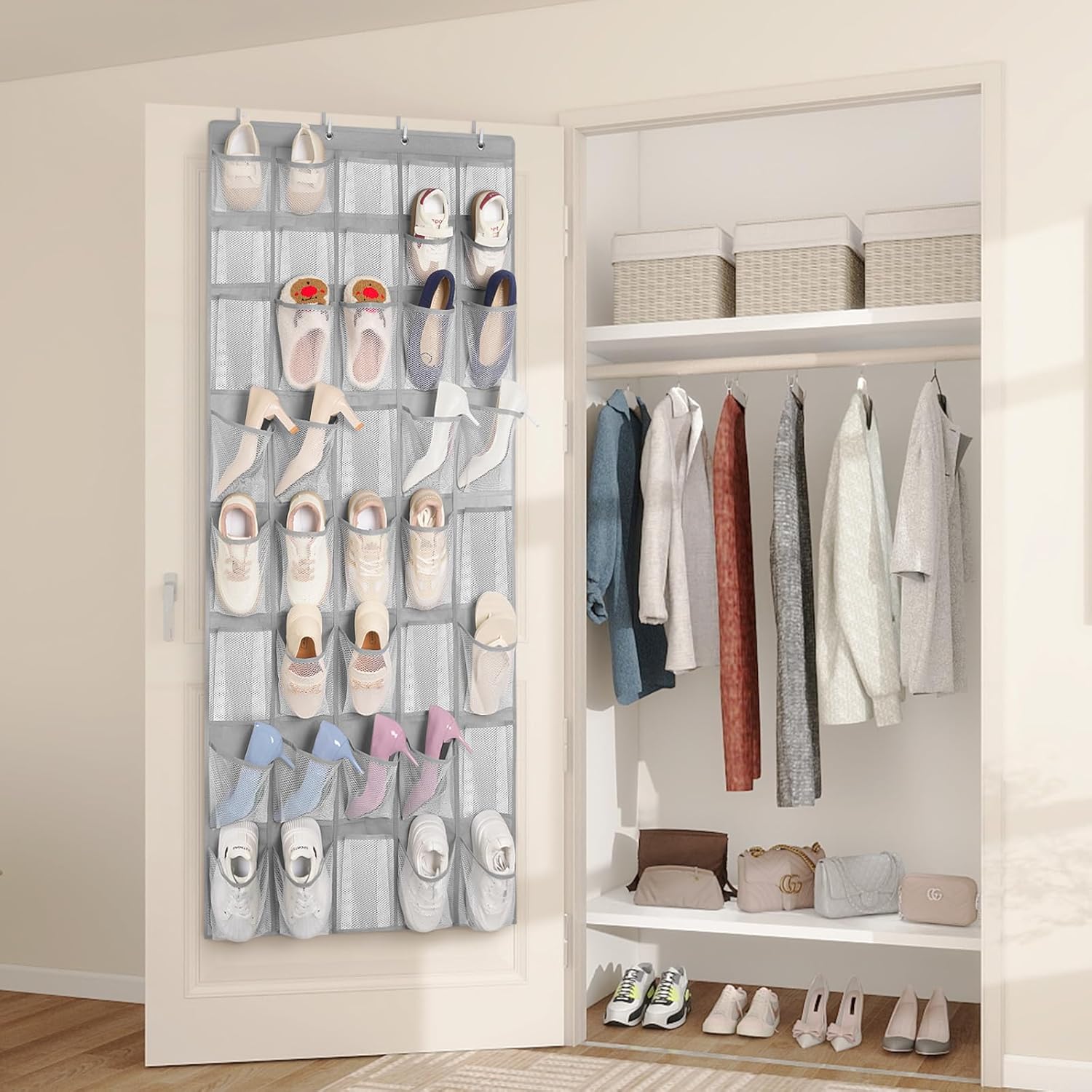 - Save Space & Maximize Storage: Our door shoe organizer takes advantage of unused vertical space, freeing up floors and walls—ideal for entryways, closets, bedrooms, apartments, or dorms. Hanging shoe organizer maximizes storage capacity, allowing you to store more shoes in tight spaces while keeping your home neat and clutter-free!
