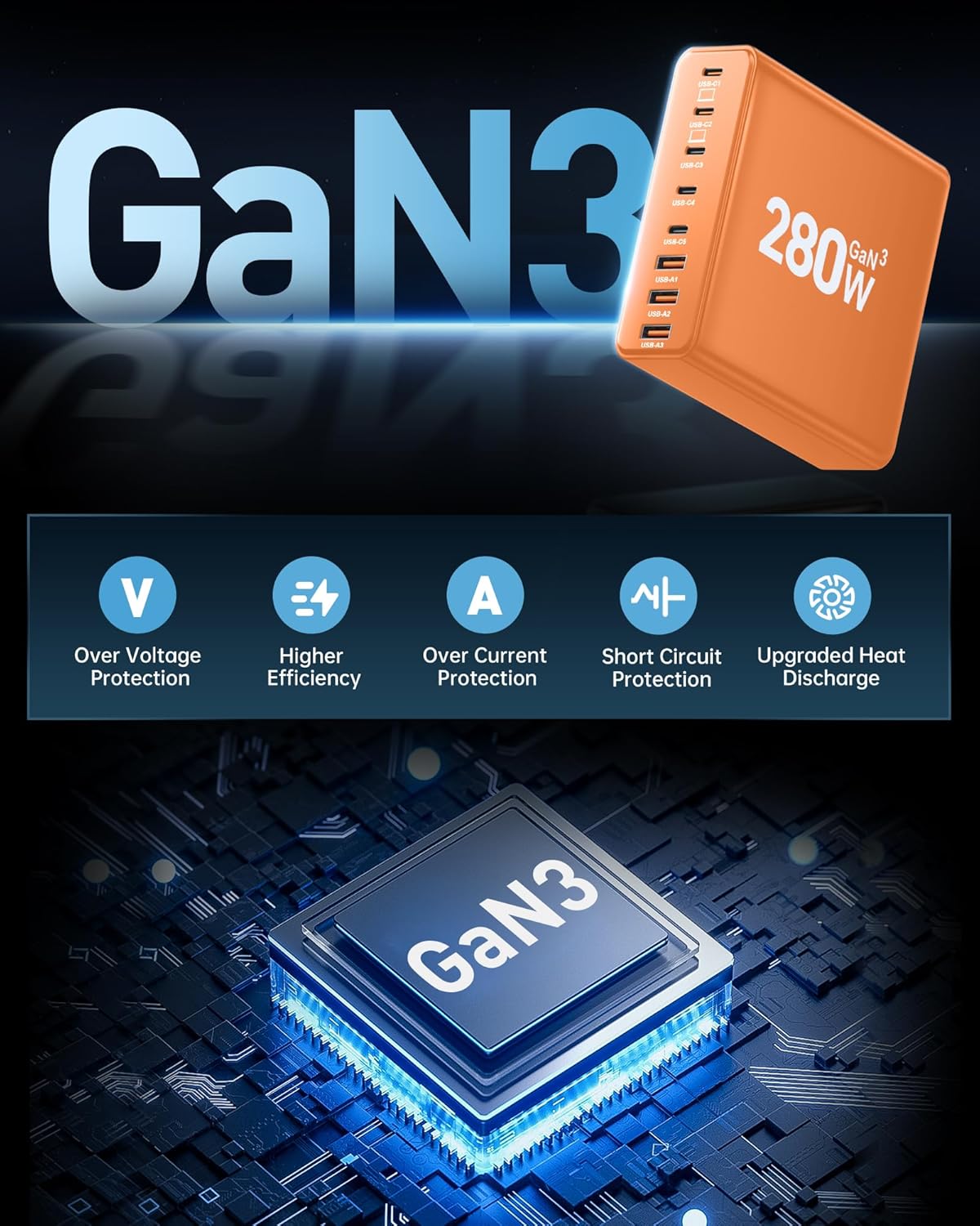 280W USB C Charger Block, 8-Port USB C Charging Station GaN III PD 65W Laptop Charger Adapter Compatible with MacBookPro/Air,DELL,iPad,Portable Charging Station for iPhone,Samsung Galaxy(Orange)