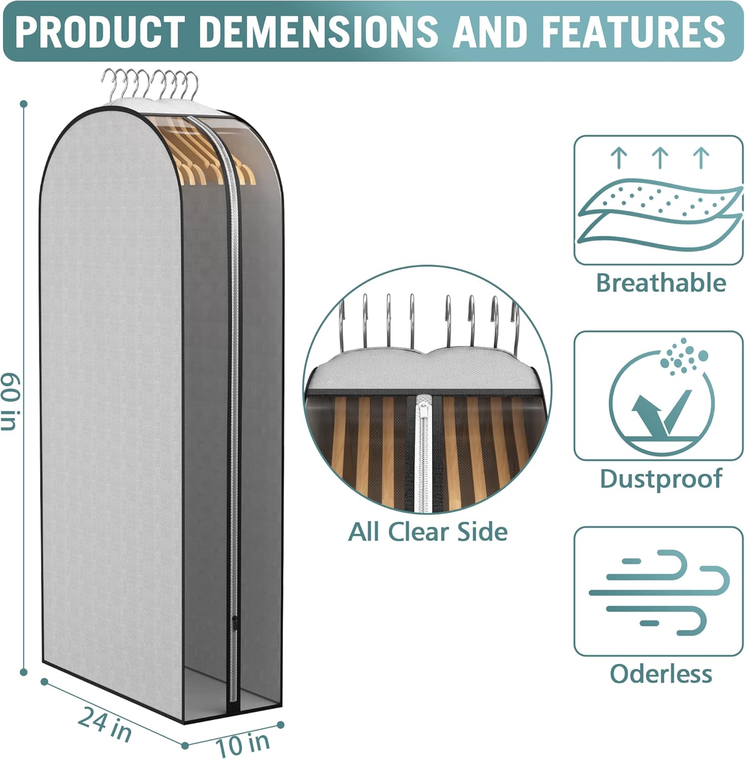 10" Gusseted Garment Bags for Hanging Clothes 60" Suit Bags for Open Closet Storage, Side Clear Clothing Cover for Coat, Dress, Jacket, Shirt, Fur Wardrobe Protector, 3 Packs, Grey