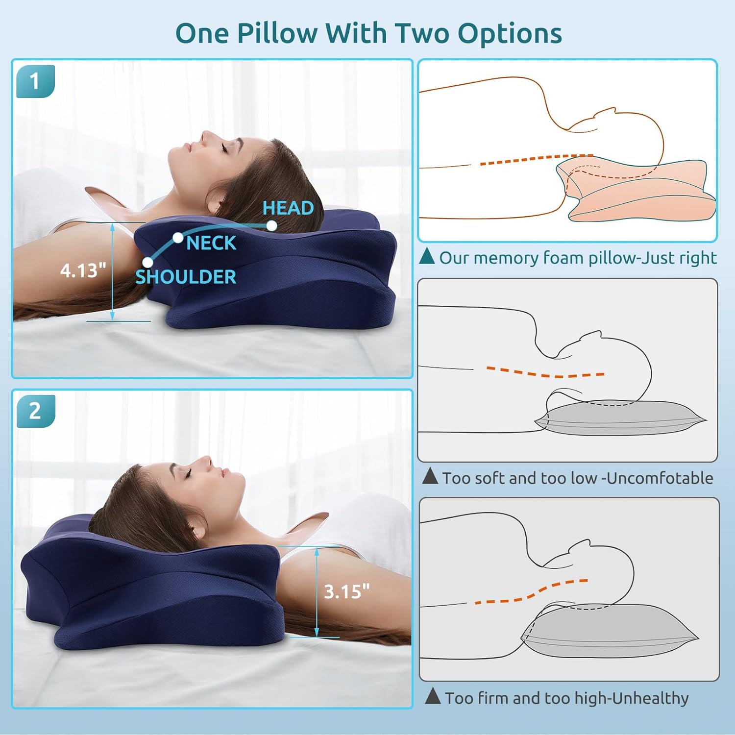 - 【QUALITY SLEEP STARTS WITH A GOOD PILLOW】Are you always waking up with neck cramps or back pain? Our proven ergonomically designed, contoured memory foam pillow supports your head, neck, shoulders and back perfectly. The innovative design allows our pillows to naturally fit your curved spine perfectly, providing proper support for spinal alignment,makes you to shift between positions comfortably.So you will wake up relaxed and start a more energetic day.