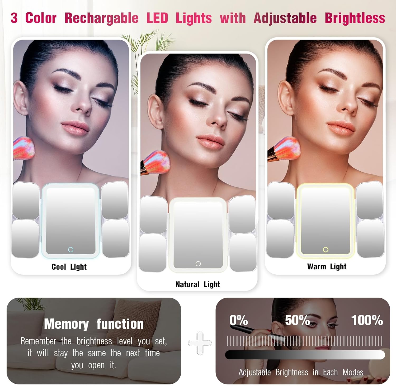 - 【Three-color Light Mirror】stepless adjustment of brightness. Short press to adjust the color temperature, long press to adjust the brightness. Built-in rechargeable battery, which can last for two weeks on a single charge, comes with a Type-C charging cable.