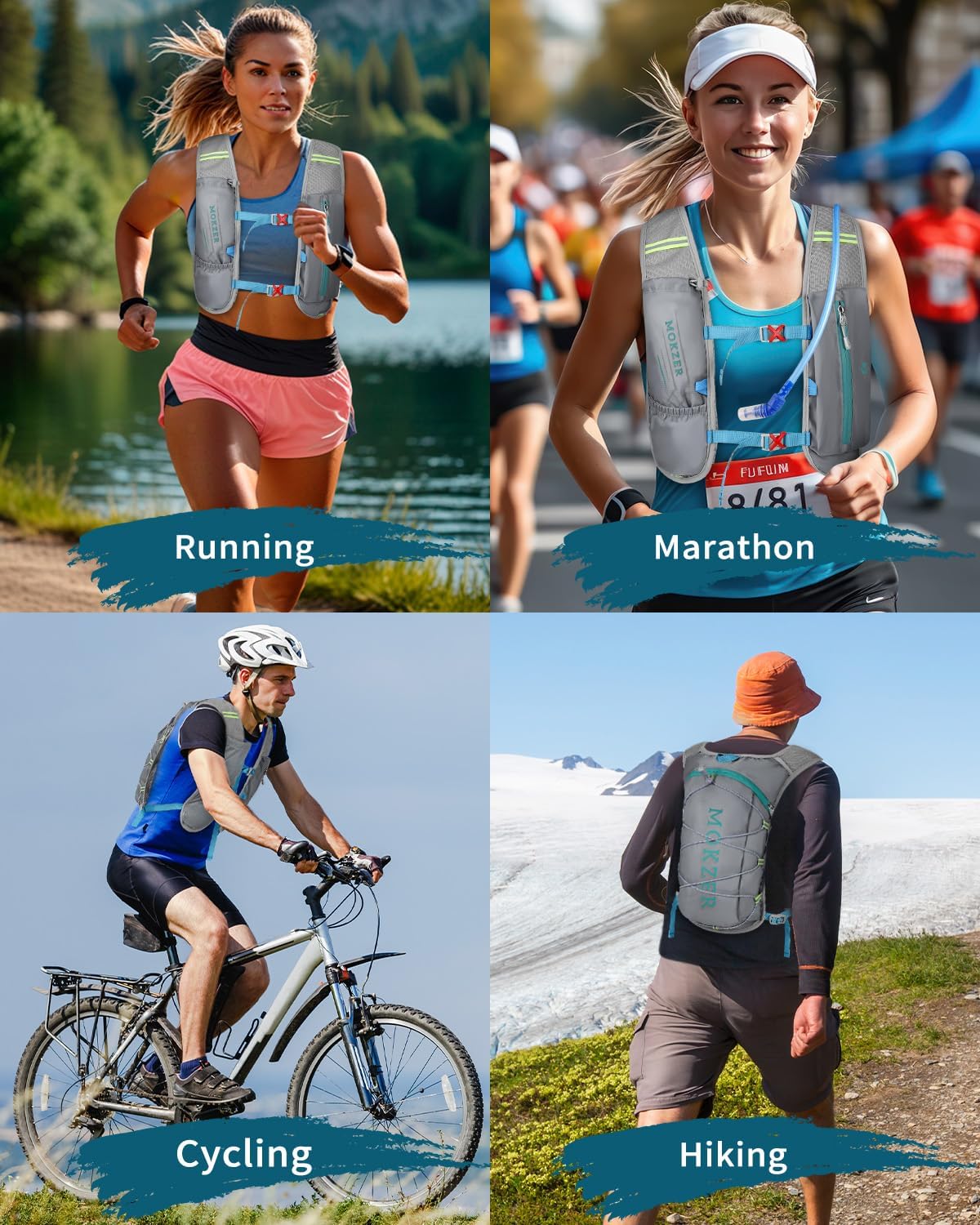 - [Leightweight 5L Hydration Vest for Sports] Our hydration packs are made from high-density nylon, which is durable and waterproof, yet weighs only 140g. Like a regular vest, you won't feel burdened during activities such as running, hiking, cycling, marathons, and trail adventures, etc