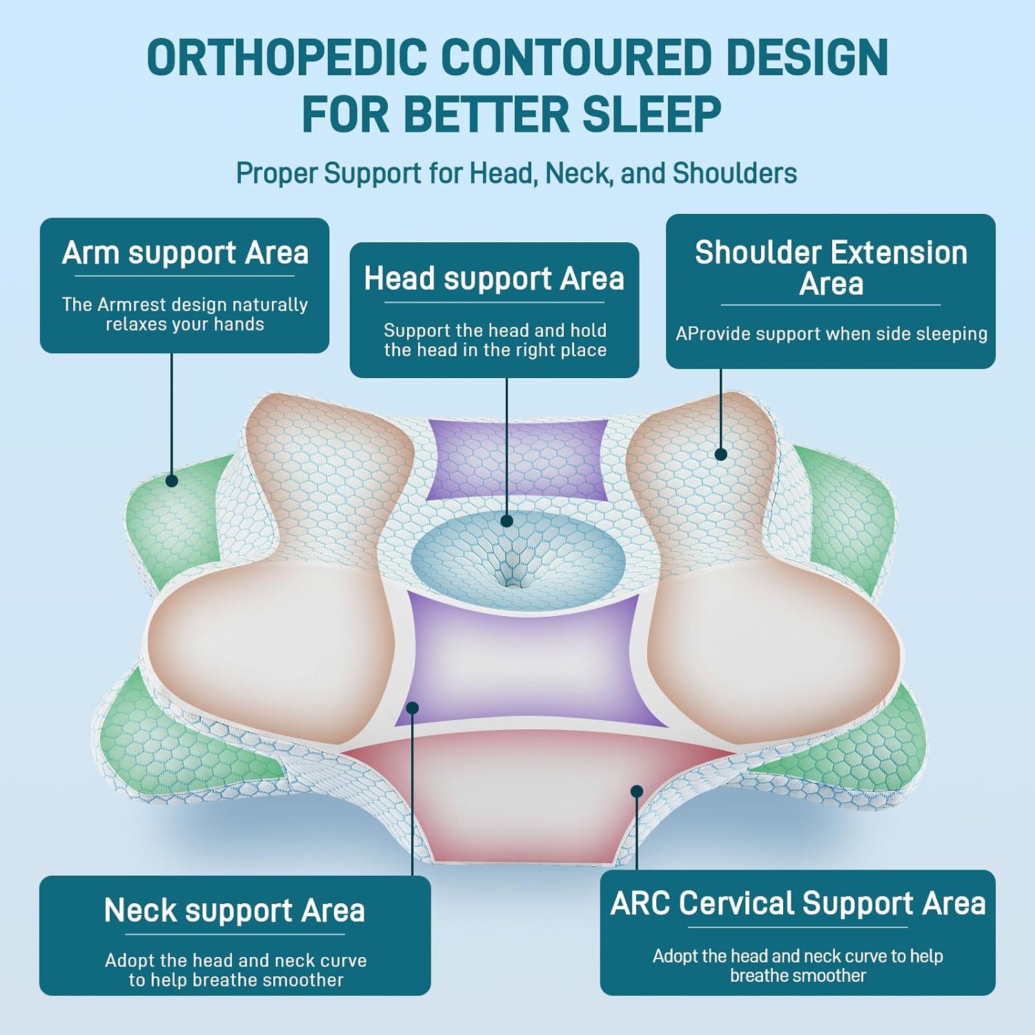 - Dual Height Contour Support – The dual height contour pillow fits all sleeping positions. The higher edge supports side sleepers, while the lower curve is ideal for back and stomach sleepers