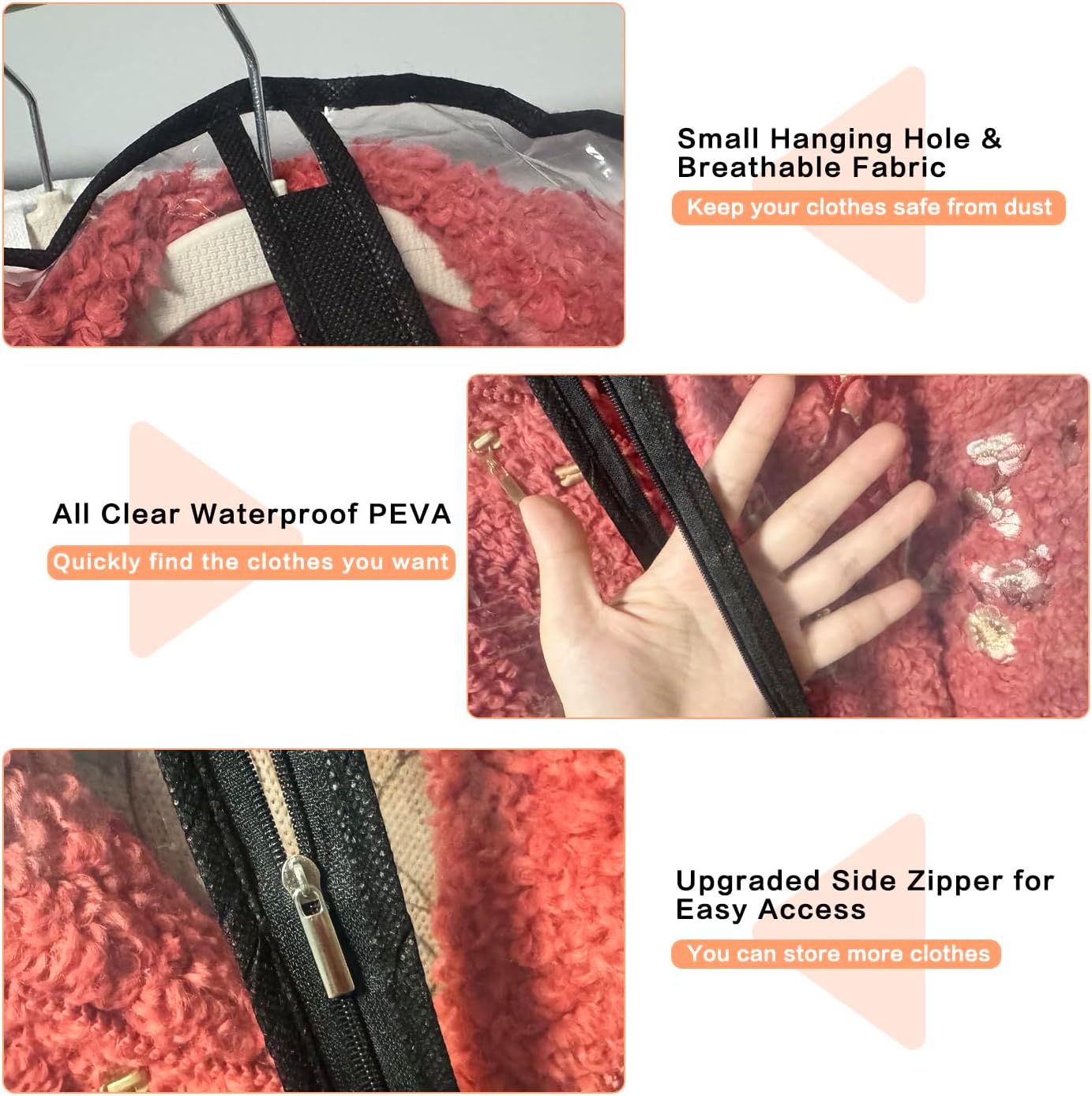 - 📣【DURABLE & LONG-LASTING】:Made of soft and durable PE material with a thickness of 50gsm, This upgraded version clear garment bags for storage is washable, lightweight and built to last. Dustproof and water-resistant plastic garment bags protect your delicate clothes against dampness, dust, pet hair, and keep them fresh and wrinkle free!