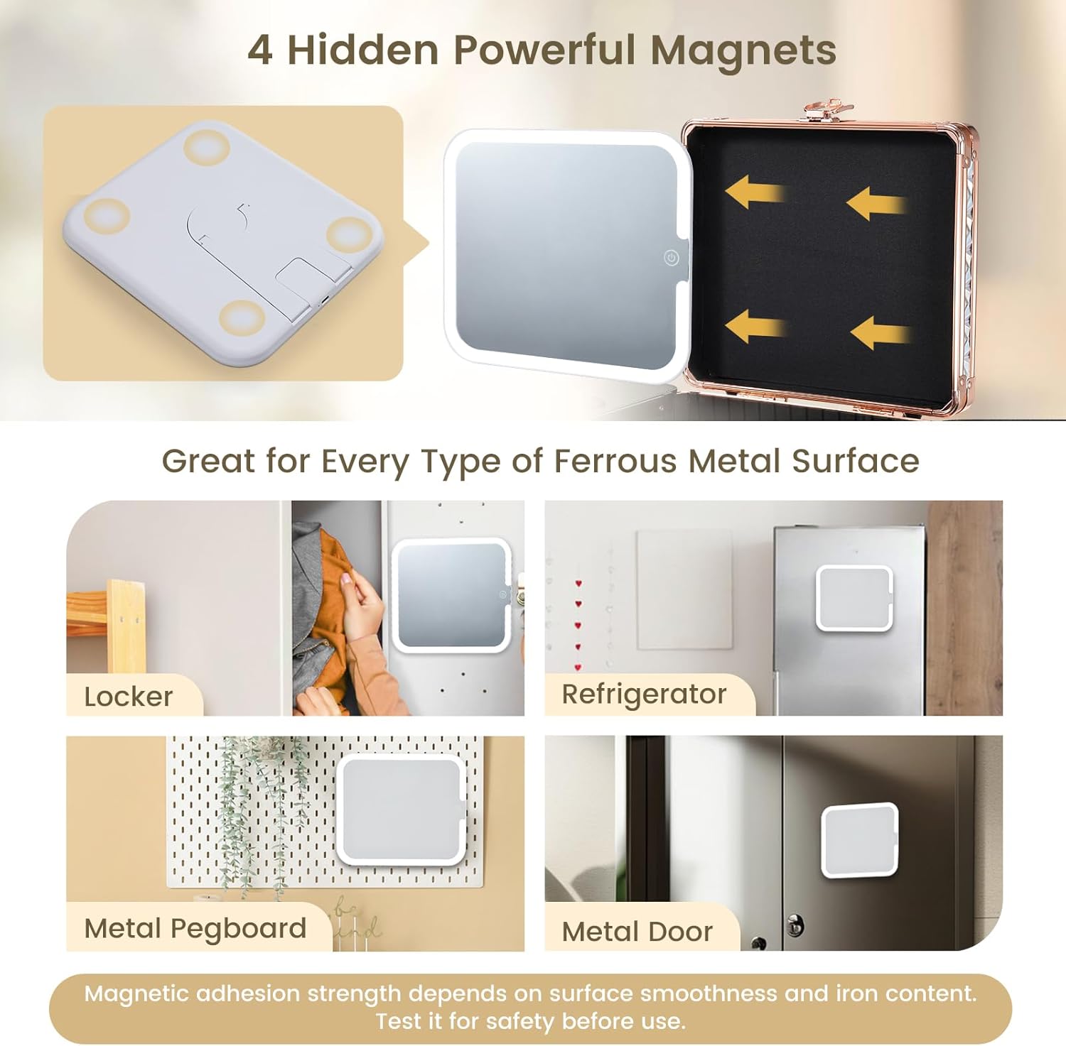 - 【MAGNETIC VANITY MIRROR】- Equipped with four hidden magnets, allowing it to function as a fashionable wall mirror that can easily be attached to a variety of ferrous metal surfaces. Whether you choose to place it on lockers, fridges, toolboxes, or even office cabinets, it seamlessly combines practicality with a sense of elegance. Its design not only adds a touch of class to any space but also enhances the convenience of having a mirror readily accessible wherever you may need it.
