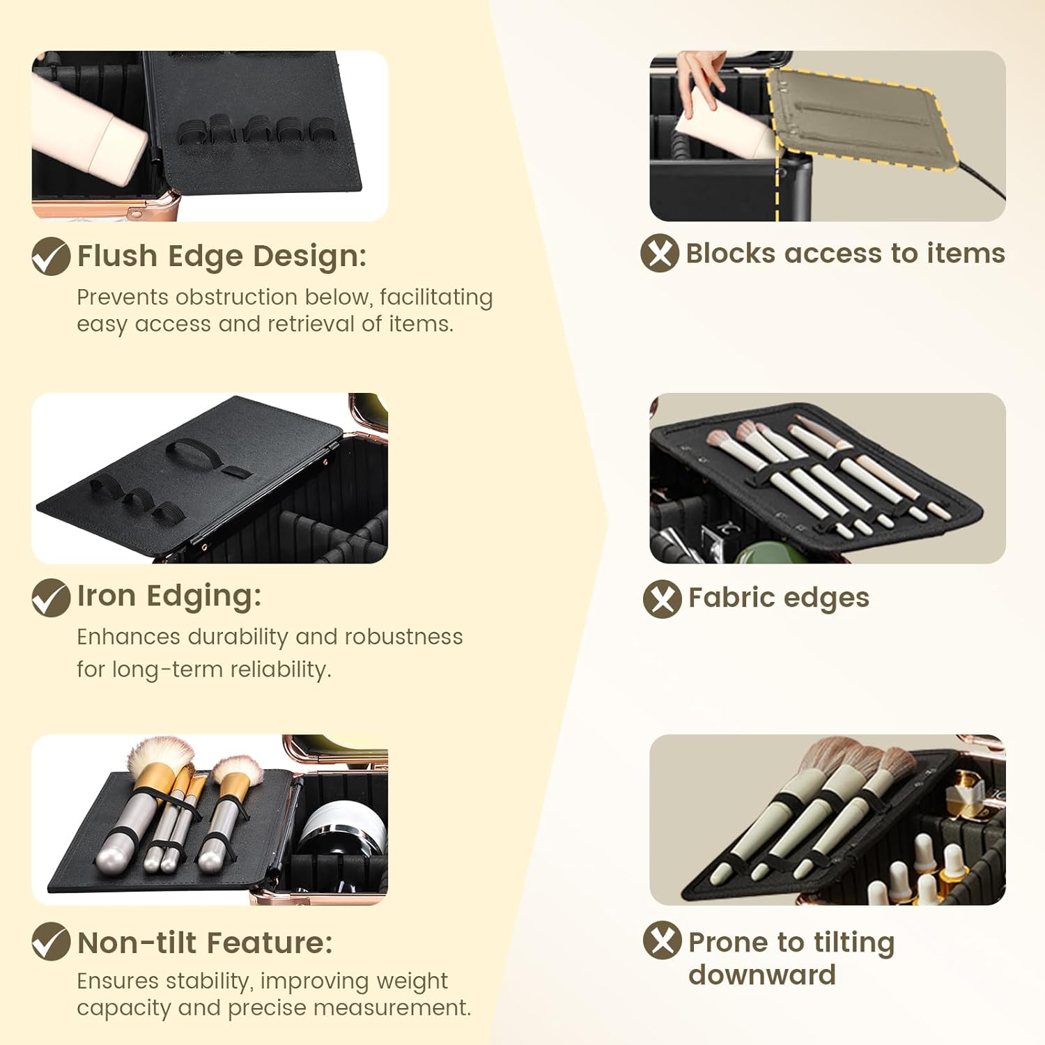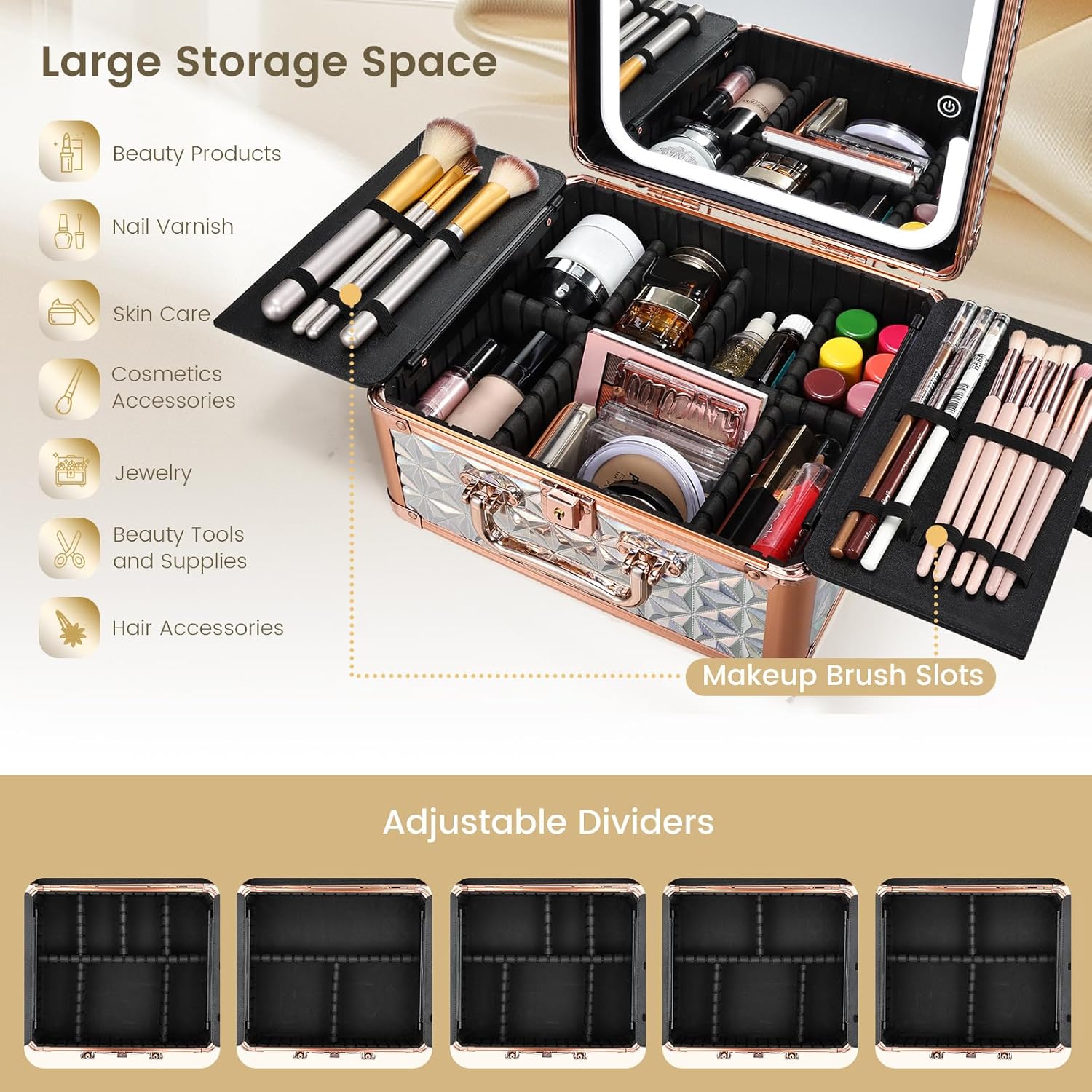 - 【ALL-IN-ONE MAKEUP BOX ORGANIZER】- This makeup box features six removable EVA partitions and two brush storage boards for tailored organization. The shock-absorbing sponge pads safeguard your cosmetics, while the partitions are waterproof and simple to maintain.