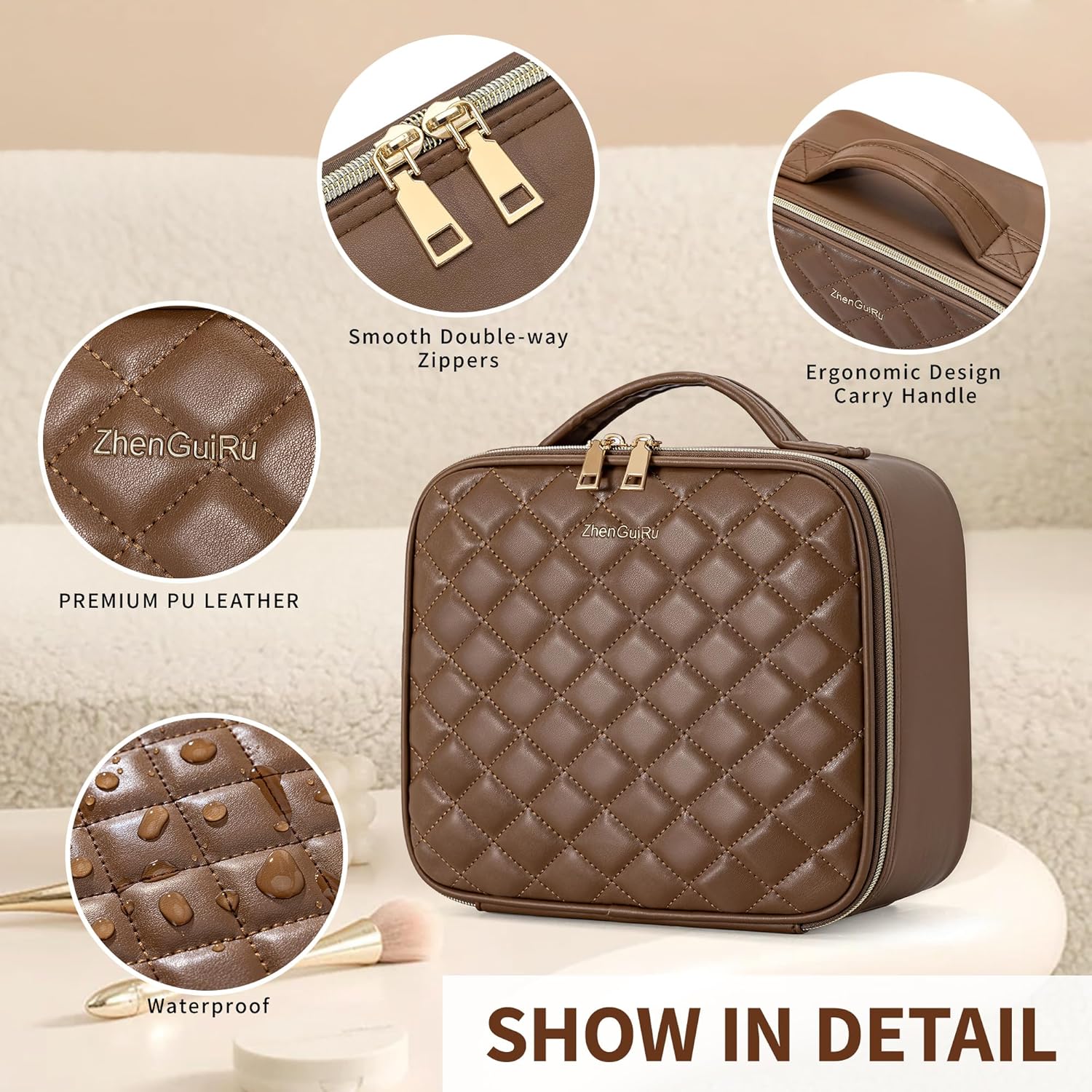 - 【Premium PU Leather & Waterproof Coating】Crafted from lychee‑embossed PU leather with a durable nylon lining and stain‑resistant finish, this Travel Makeup Bag wipes clean in seconds.