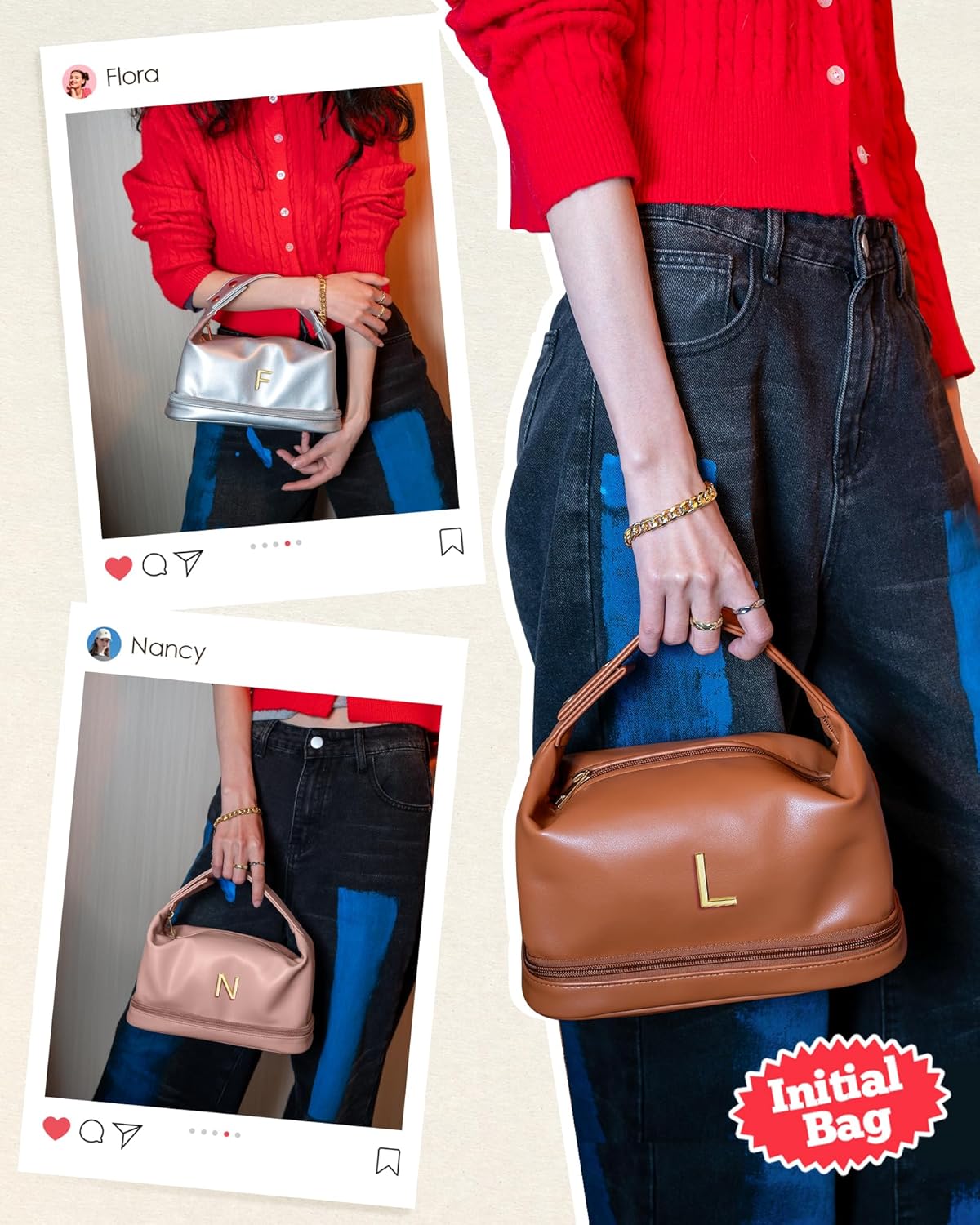 - 【Double-layer Design】The monogrammed makeup bags is double-layer with a unique design of upper and lower storage areas. The bottom compartment is great for storing cosmetics, eye shadows, makeup brushes, and other items. The top layer features a large opening for easy access, along with two small compartments for lipsticks and earrings.