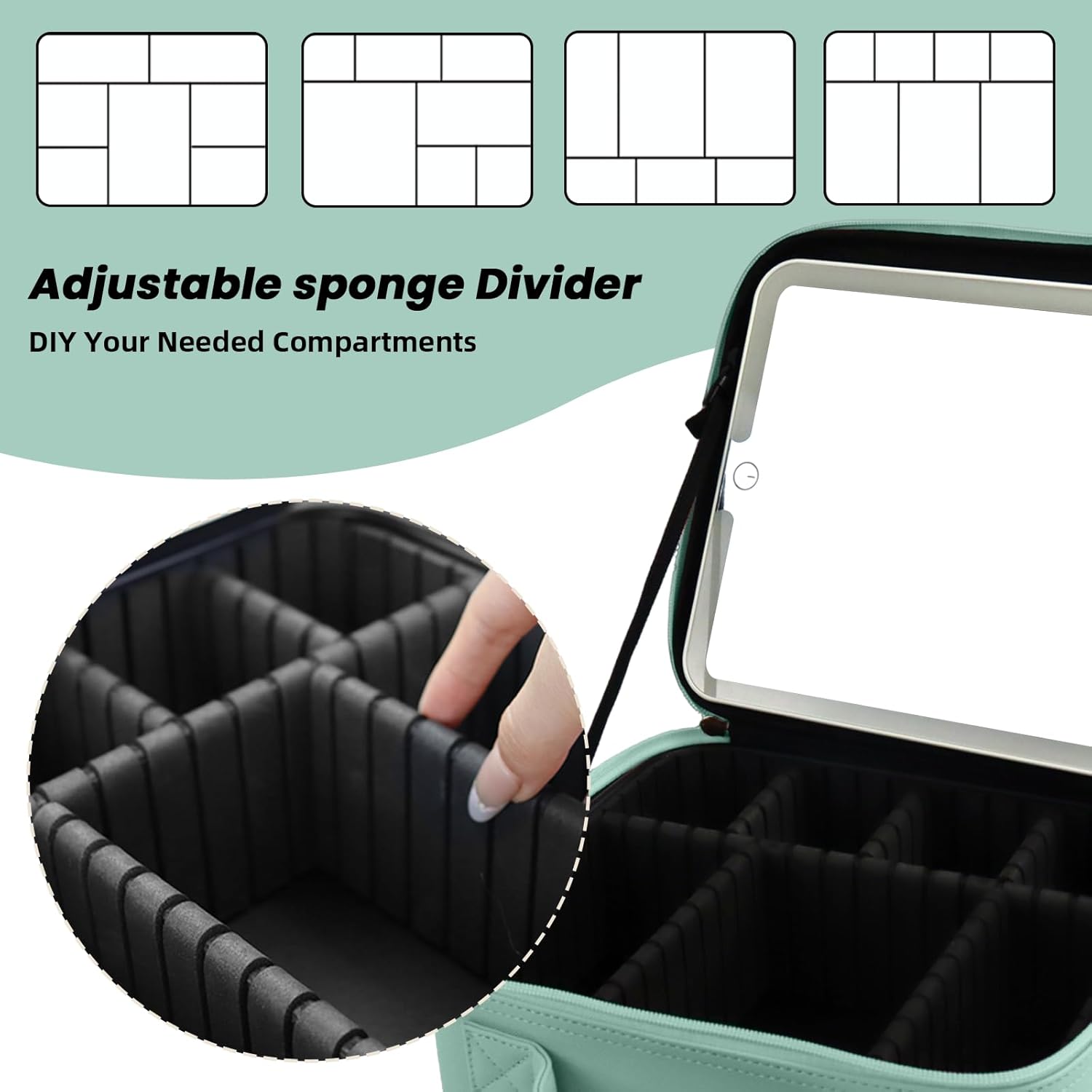 Travel Makeup Bag with LED Mirror and Light Makeup Travel Bag Organizer Portable Cosmetic Brush Organizer Bag with Adjustable Dividers for Cosmetics Makeup Brushes Toiletry (Light Green)