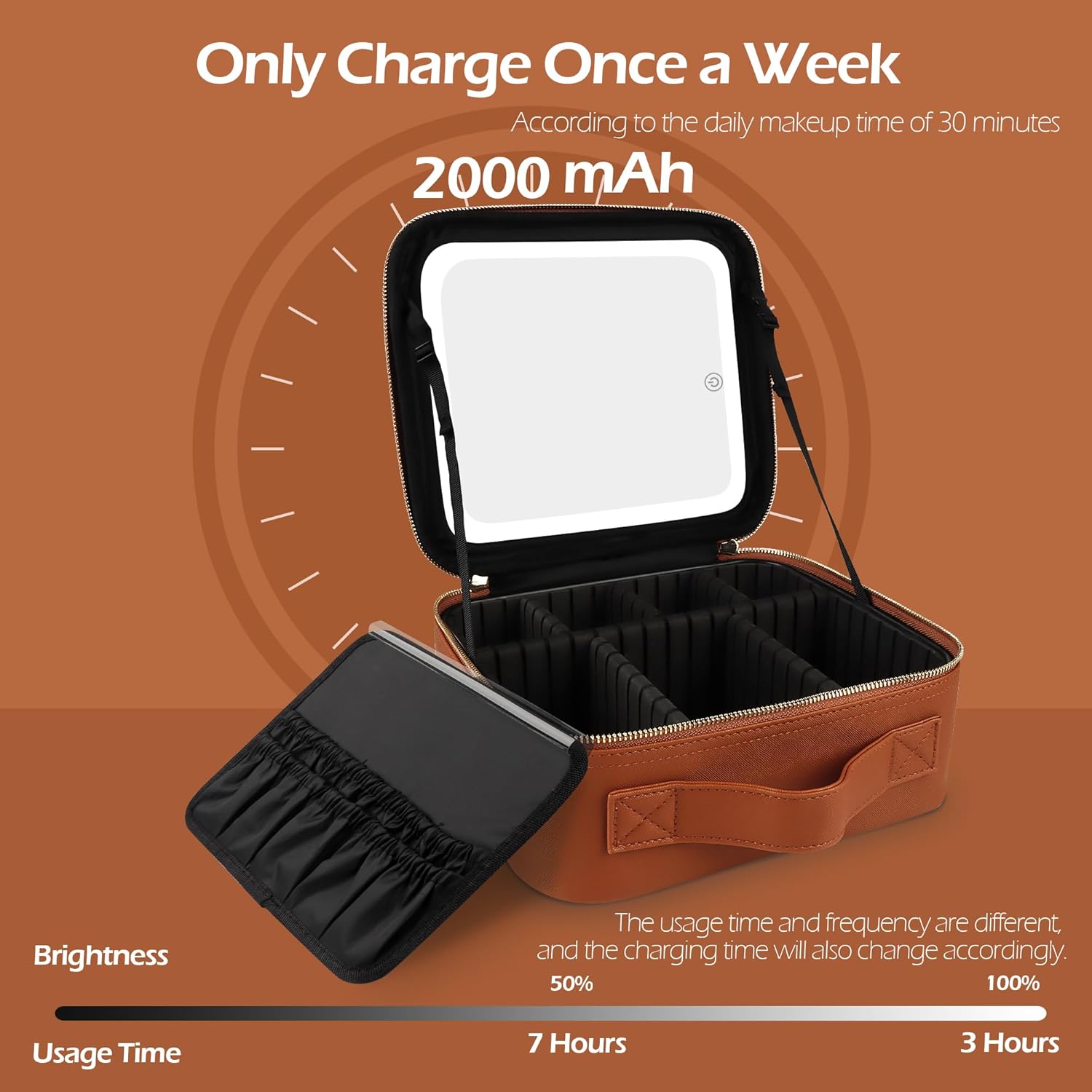 MOMIRA Travel Makeup Bag Cosmetic Bag Makeup Organizer Bag with Lighted Mirror, Adjustable Brightness in 3 Color Scenarios, Waterproof Makeup Train Case, Gift for Women - Tangerine Brown