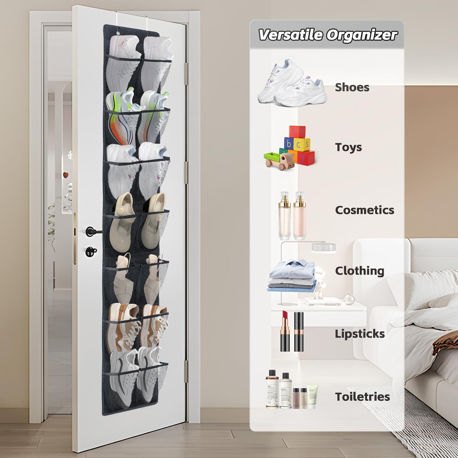 - 65โ OVER-DOOR STORAGE SOLUTION: Full-length organizer stays flush against doors without blocking handles. Lightweight yet sturdy for hassle-free hanging