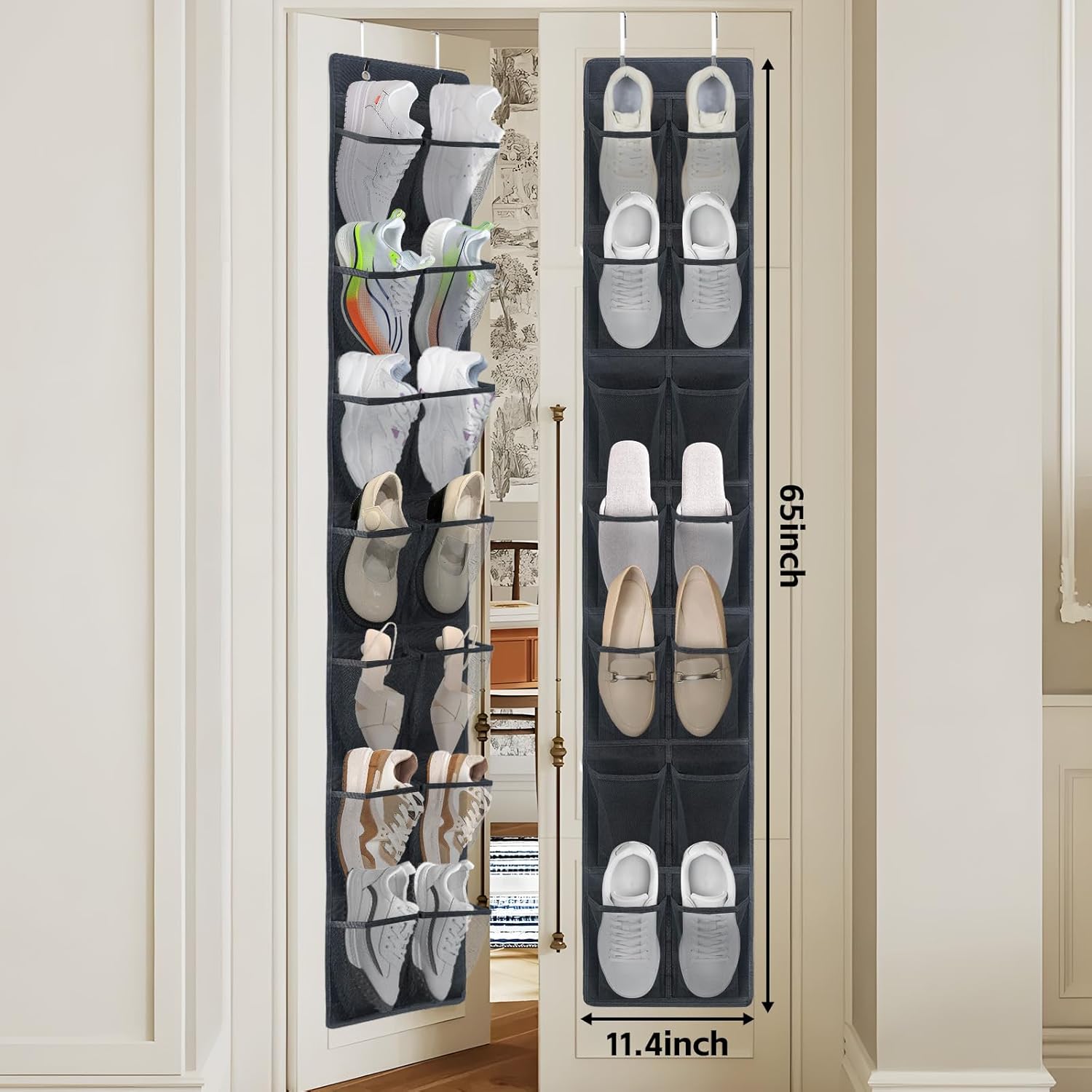 - OVER-DOOR SHOE ORGANIZERS WITH 28 POCKETS: Store 14 pairs of shoes, including womenโs heels, sneakers, or menโs size 13 footwear. Reinforced mesh pockets prevent sagging and keep items visible