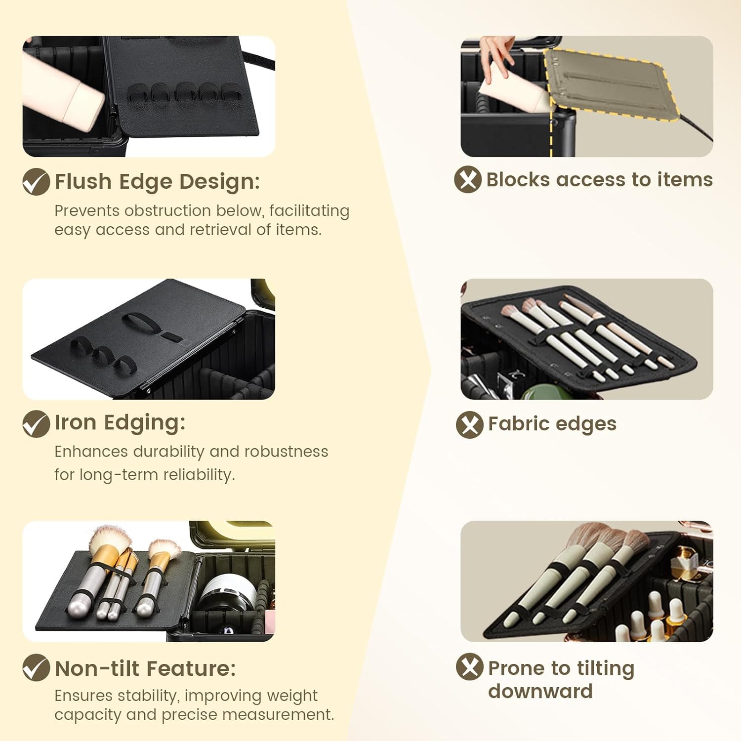 - 【ALL-IN-ONE MAKEUP BOX ORGANIZER】- This makeup box features six removable EVA partitions and two brush storage boards for tailored organization. The shock-absorbing sponge pads safeguard your cosmetics, while the partitions are waterproof and simple to maintain.
