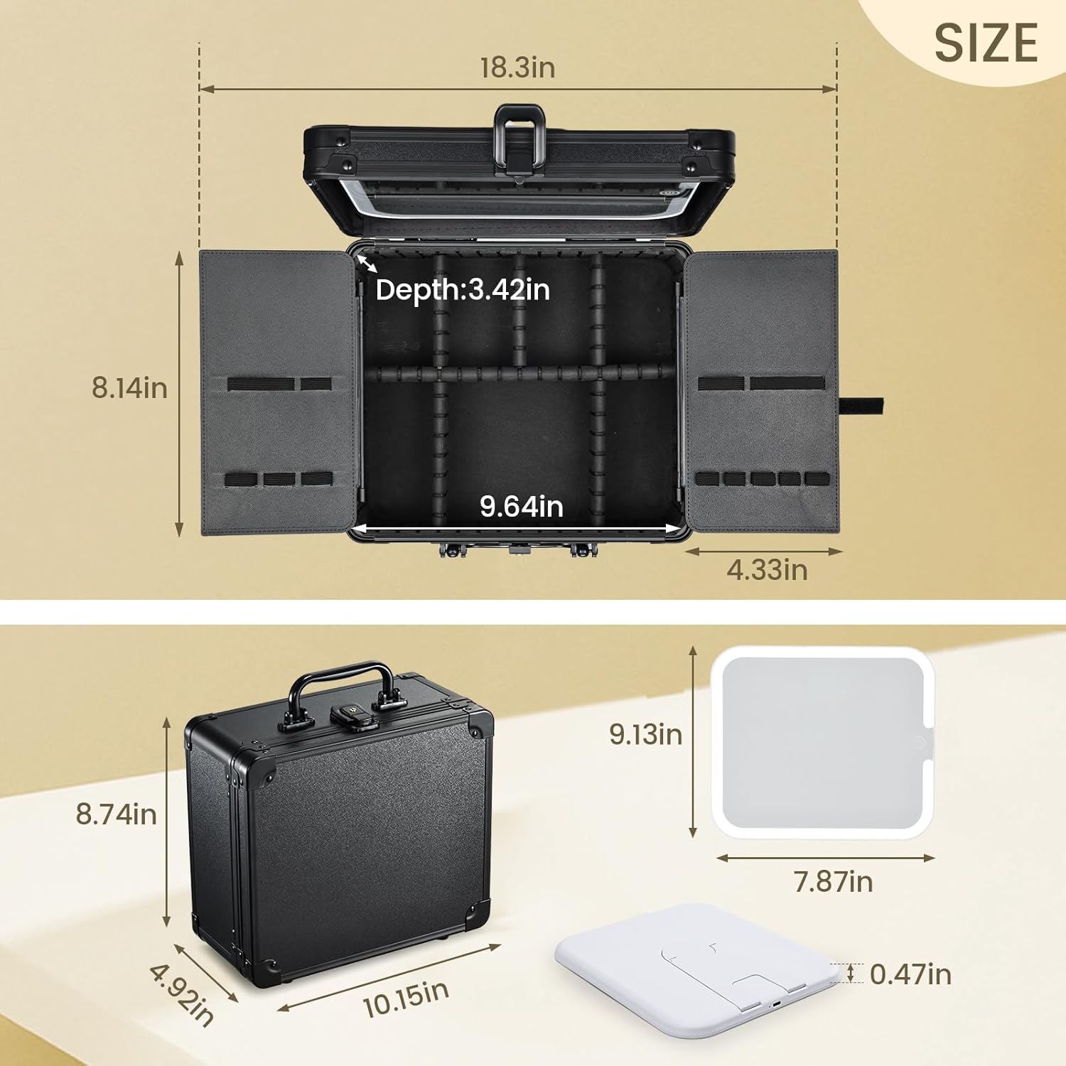 - 【3 COLOR FILL LIGHT MIRROR MAKEUP CASE】- Makeup case with a smart full-screen illuminated mirror that can be independently removed for use. The mirror features a 360° swivel bracket and can tilt at angles of 30°, 60°, and 90°, making it perfect for use on a desk. A gentle touch of the switch allows for effortless adjustment between cold, neutral, and warm color temperatures, while a long press can vary the brightness from 0% to 100%.