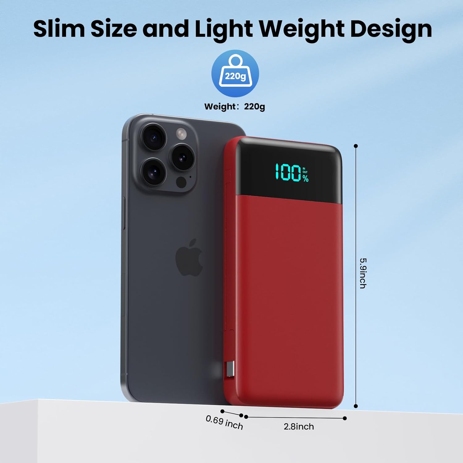 - ăLightweight & Slim DesignăThis battery pack size only 5.9x2.7x0.7 inch and a weight of 220g,Its lightweight construction makes it extremely convenient to carry on the go without adding any extra weight , suitable for airplane travel or outdoor activity that brings you the best experience on the go.