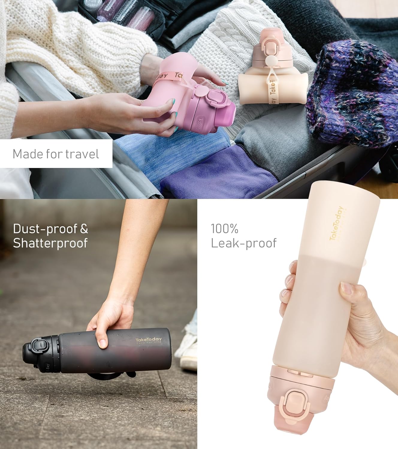- [Sturdy] The TakeToday collapsible water bottle is composed of high-quality food grade silicone. Unlike glass cups and plastic bottles, which are easily broken, the bottle body is soft and robust, able to withstand dropping, squashing, smashing, and hits, so you can enjoy using it without worry
