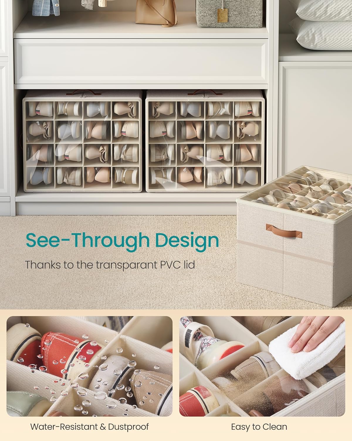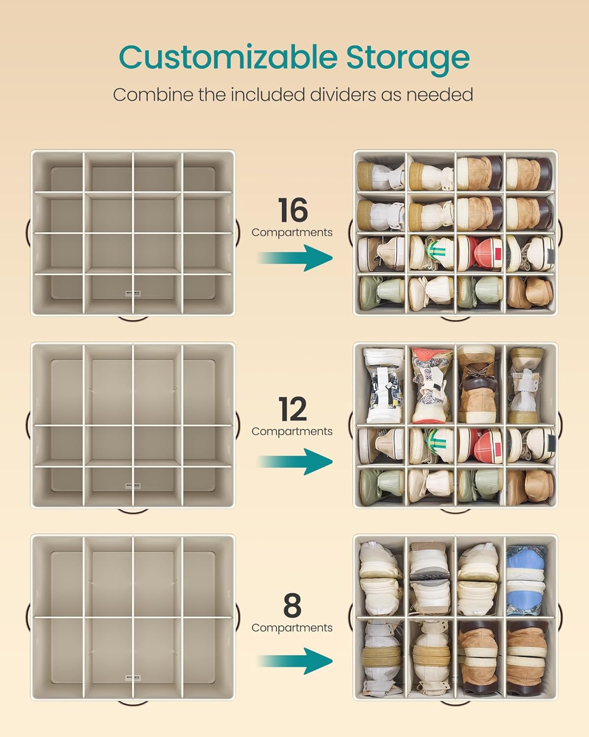 SONGMICS Shoe Organizer for Closet, Shoe Storage Bin, Fits 16 Pairs, Fabric Container with Handles and Clear Cover, Adjustable Dividers, Customizable, Cappuccino Beige ULSP555K01