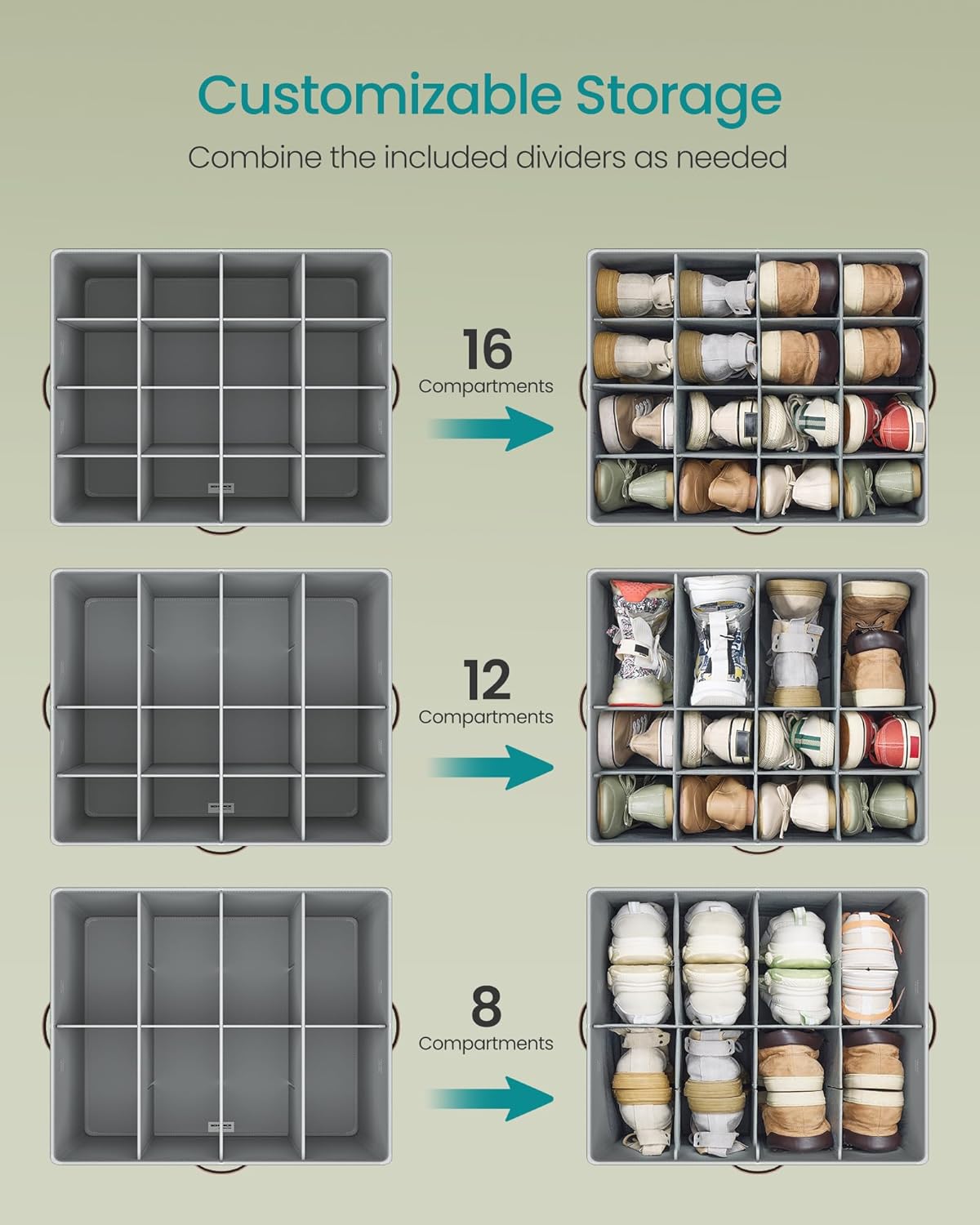 - Customisable: Flexible dividers allow compartments to adjust according to shoe size. The storage box can hold shoes, clothes, and bags of different sizes