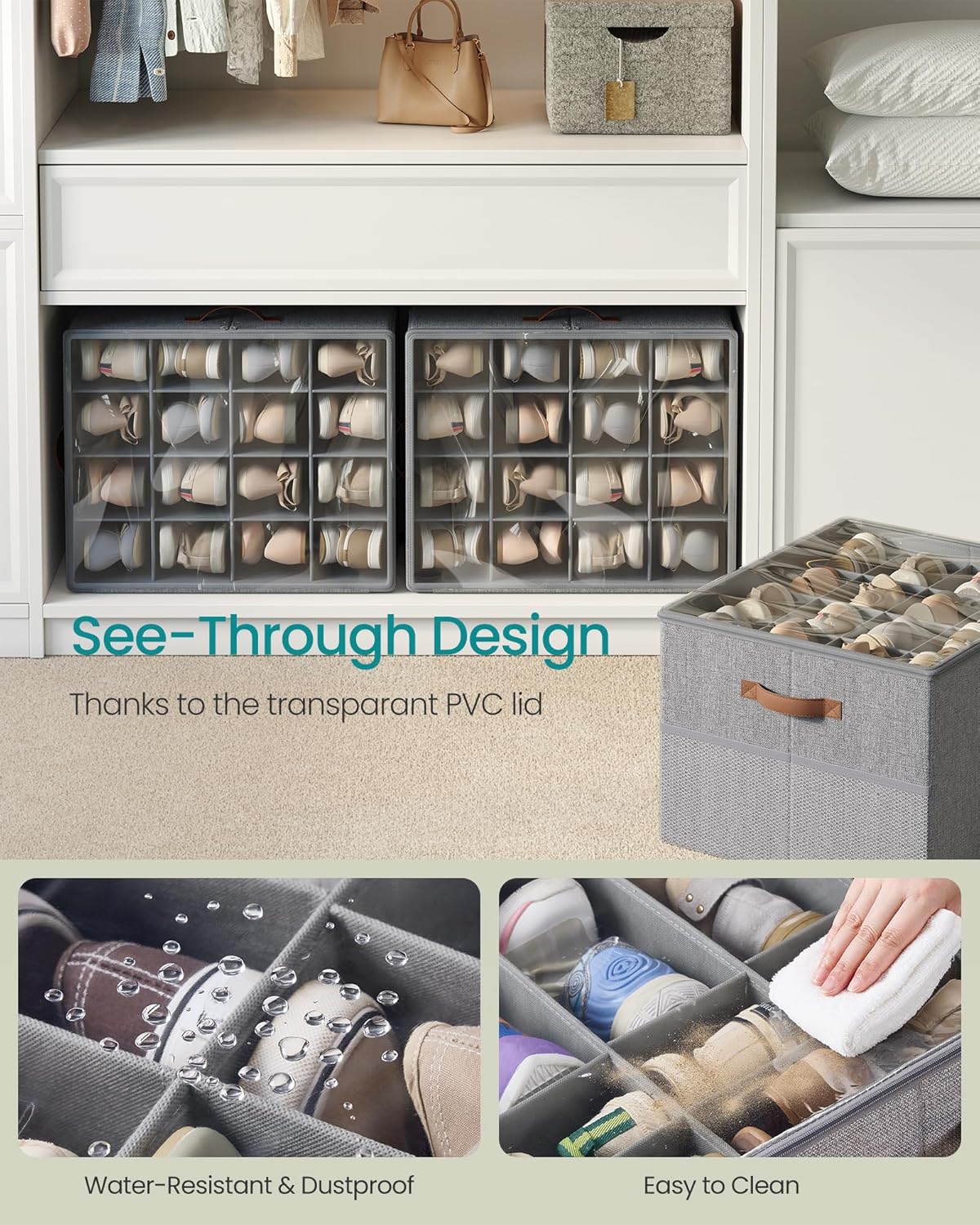 SONGMICS Shoe Organizer for Closet, Shoe Storage Bin, Fits 16 Pairs, Fabric Container with Handles and Clear Cover, Adjustable Dividers, Customizable, Dove Gray ULSP555G01